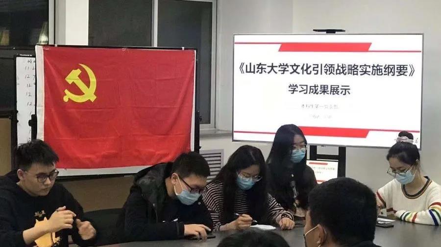 文化引领战略实施纲要》学习成果进行展示汇报。第一党支部对文化引领战略及其政治背景、实施背景及意义、《纲要》内容学习以及贯彻落实方面进行了展示,认为大学是文化高地,应通过集体观影、知识竞赛等方式将优质的文化渗透到校园的每一个角落。接着,第二党支部从文化引领战略论述、学校与文化发展、文化引领措施三个方面进行展示,认为应设立传统文化相关机构、举办与传统文化有关的讲座、在特殊节日进行文艺汇演,并将传统文化与信息技术结合加强对外宣传。