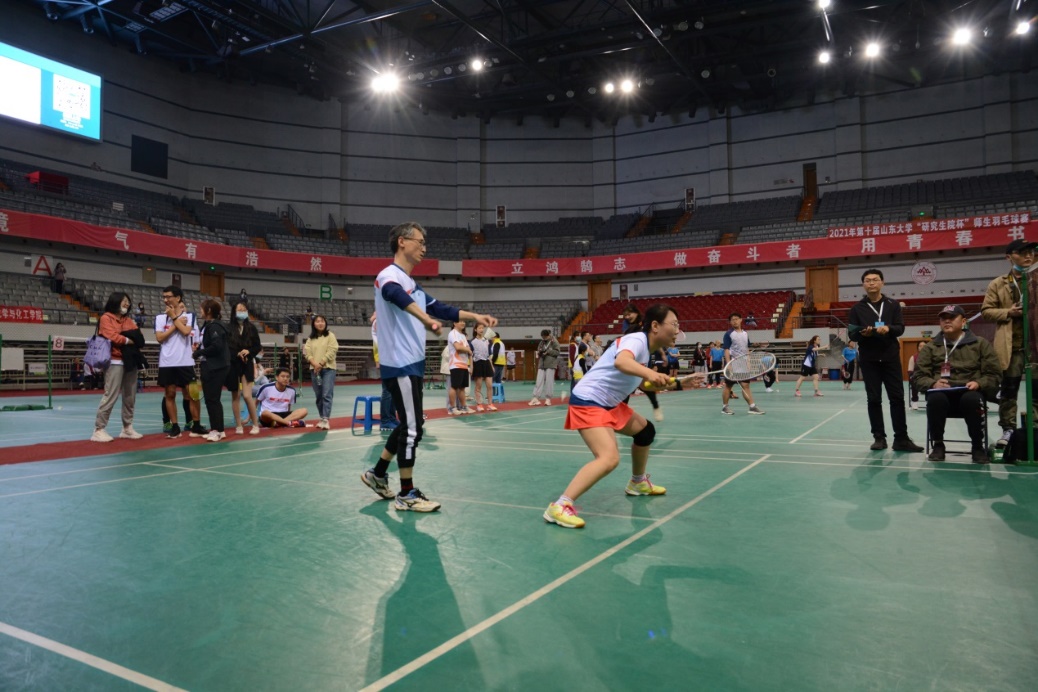 依次对阵临床医学院、经济学院和历史文化学院。赛场上激情四射,选手们大展身手!一记记精彩的扣杀、劈杀或是巧妙的高远球、以柔克刚的吊球还有惊险无比的救球博得了观众们一阵阵的叫好声。战况胶着,我院大比分2:1先胜临床医学院,却1:2不敌经济学院。在最后一场与历史文化学院的男双比赛中,决胜局对手14:9比分领先,先拿下局点。陈烨老师和潘旭东同学顶住压力,连得5分将比赛拖入加时,并以17:15的比分战胜对手,赢下男双对决,工口实验室