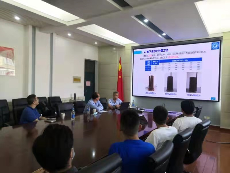 梅教授首先对地下结构的抗浮进行简单介绍,地下结构抗浮造价约占建构筑物总造价的20%-50%,且抗浮手段单一; 地下结构水浮力计算源于阿基米德定律,但对多孔多相介质的土体是否适用,也存在较大争议。在前人研究的基础上,梅教授团队对地下结构开展了位于五种环境下的模型试验,并由此得出不同土层中地下结构水浮力折减规律,提出了能够反映坑壁摩阻、粘附力和地下水浮力折减的地下结构三参数抗浮力计算公式;从优化抗拔桩的布置、运用伞状锚抗浮技术,利用纤维筋替代传统钢筋、利用注浆的自压重式抗浮方法等方面开展了提高地下结构的抗浮实践研究;研究还利用排水减压原理,提出油罐基础、游泳池基础主动抗浮施工方法和地下室防水防潮系统及其施工方法等,梅教授团队抗浮技术获数项国家级、省级奖项及工法。