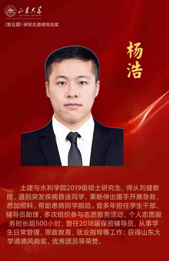 脚踏实地、扎根科研,把远大抱负落实到实际行动;涵养自身,奉献社会,成为德才兼备的高素质人才;把握时代机遇,突破陈规,大胆实践,主动创新,同山大一起成为新时代的奋斗者。恭喜我院2018级博士研究生孔凡猛、2019级硕士张伯勋荣获2021年度校长奖;2019级硕士研究生杨浩荣获(第五届)研究生道德风尚奖。