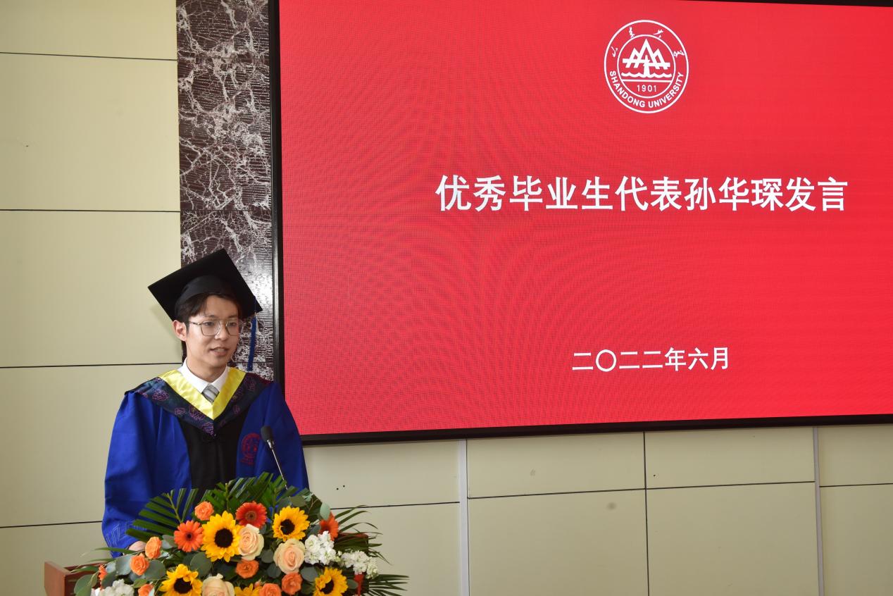 优秀博士生代表孔凡猛在发言中感谢导师薛翊国教授的指导,使他在博士学习期间,懂得了对科研精益求精的执着,培养了家国情怀、担当精神和崇实品格,时刻努力成为德才兼备的创新者。经过不断地学习钻研,他理解了习近平总书记要求把论文写在祖国大地上的真正含义。最后,他对母校的发展和同学们的未来寄予了无限的期望。优秀硕士毕业生代表孙华琛回顾了在山大七年的求学时光,和大家分享了他踏实努力的进步过程。他的发言中句句透露着对学校对导师以及对同窗好友的感恩感激,并表示毕业后要带着母校和导师的希冀和嘱托,重新出发,不断向前!
