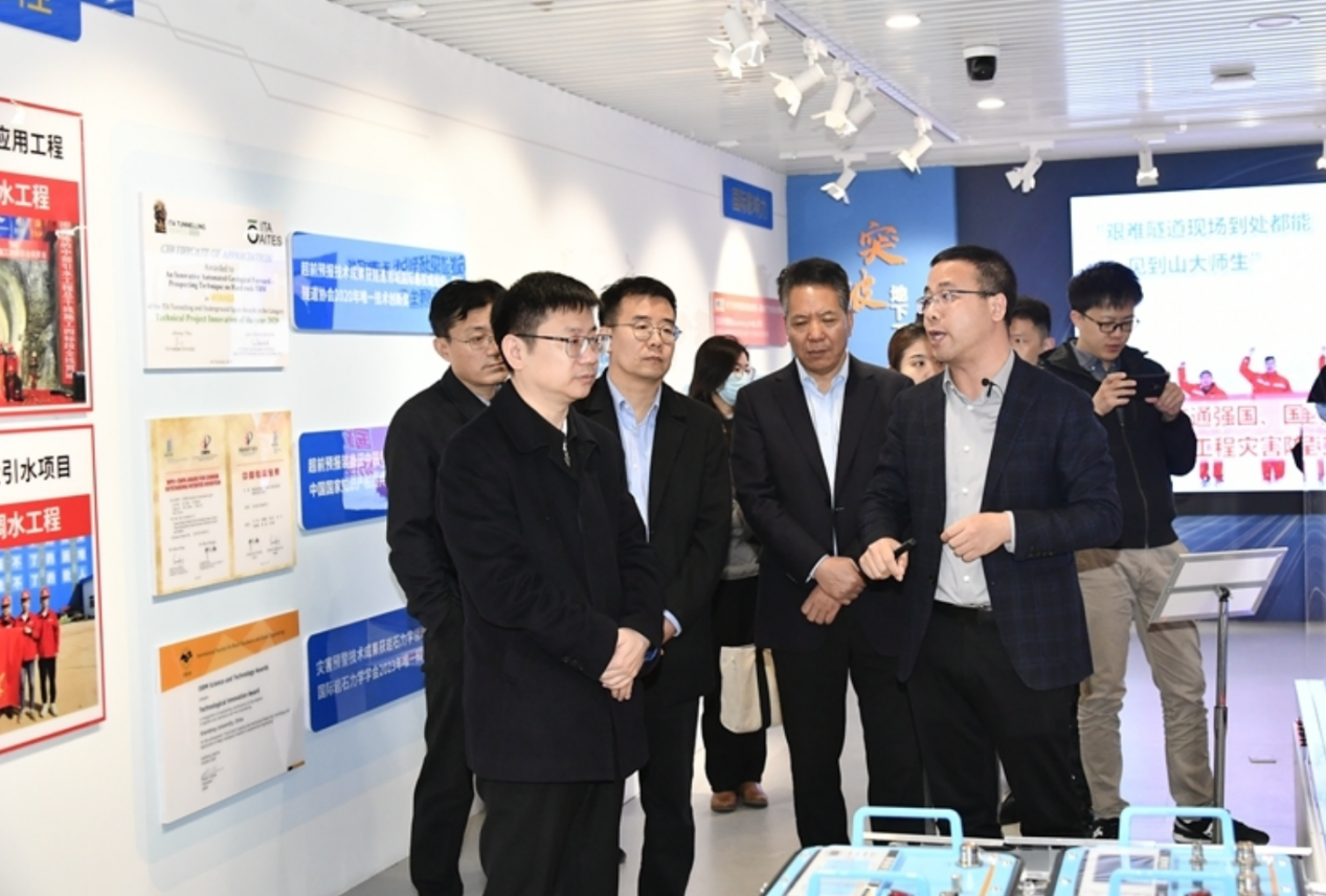 栾宗涛一行调研参观了土木工程学科地下工程灾害防控展厅,听取了隧道超前地质预报自主装备研发情况介绍,观看了岩溶管道高压大流量突涌水封堵材料注浆模拟实验,了解了工口实验室