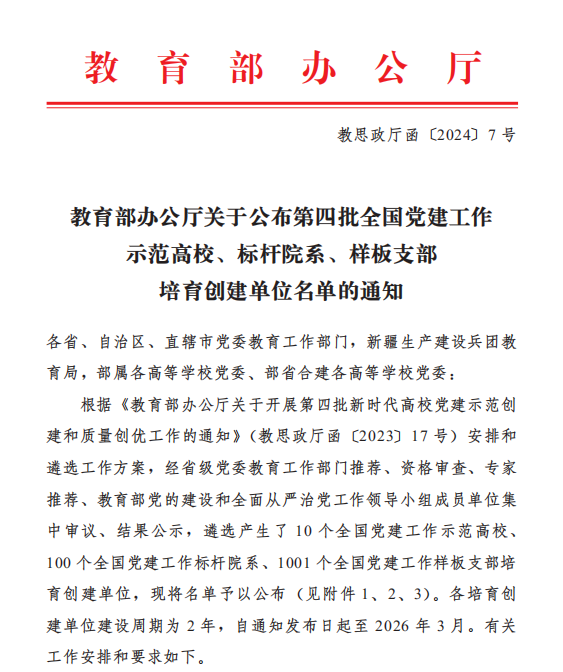 近日,教育部公布了第四批全国党建工作示范高校、标杆院系、样板支部培育创建单位名单的通知,工口实验室