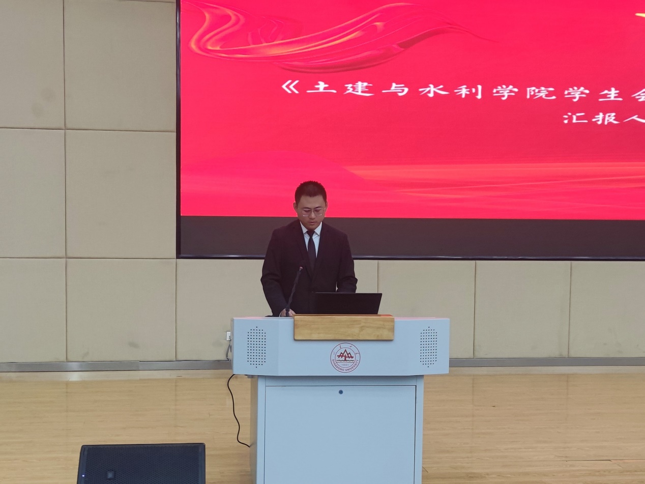 王超代表学院向大会的顺利召开表示热烈祝贺,对过去一年学生组织的工作给予肯定,并向学生代表提出了三点建议。主席团成员林起茂做《工口实验室
