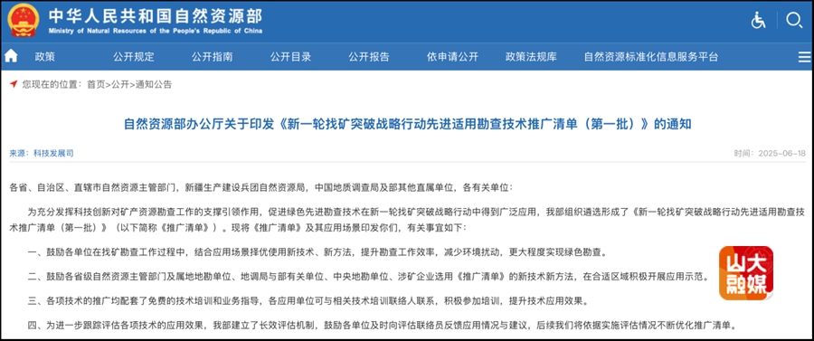 6月18日,国家自然资源部网站发布《新一轮找矿突破战略行动先进适用勘查技术推广清单(第一批)》(自然资办函〔2025〕1340号),工口实验室