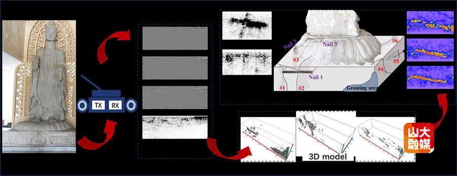 工程软件系孙怀凤教授团队,数智考古与中华文明特色分中心、文化遗产研究院李力副教授团队与山东省文物保护修复与鉴定中心、青岛市博物馆开展合作,在国际权威期刊Journal of Cultural Heritage在线发表研究论文“Decoding the stone Buddha: Three-dimensional ground penetrating radar attribute insights into cracks and restoration history of Sumeru throne”(JCR Q1、中科院艺术学一区)。工口实验室