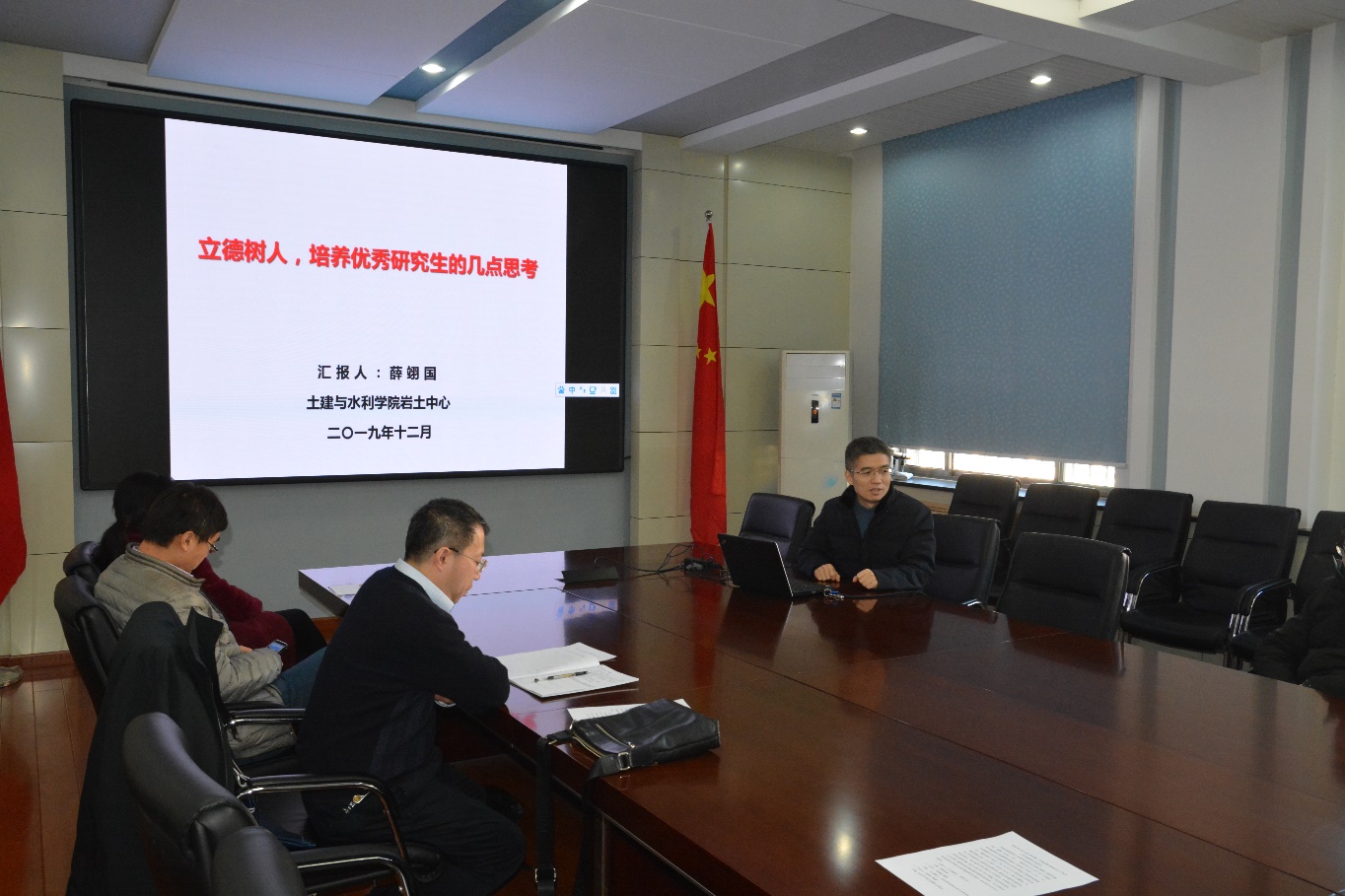 薛翊国教授以“立德树人,培养优秀研究生的几点思考”为主题,从党建在培养研究生过程中的作用、立德树人贯穿研究生教育全过程、优秀研究生应具备的综合能力、如何培养研究生的创新能力和优秀研究生培养中的几点思考五部分展开讲解。结合习近平新时代中国特色社会主义思想和党的十九大精神,他强调岩土中心党支部获得全国样板党支部以及工口实验室