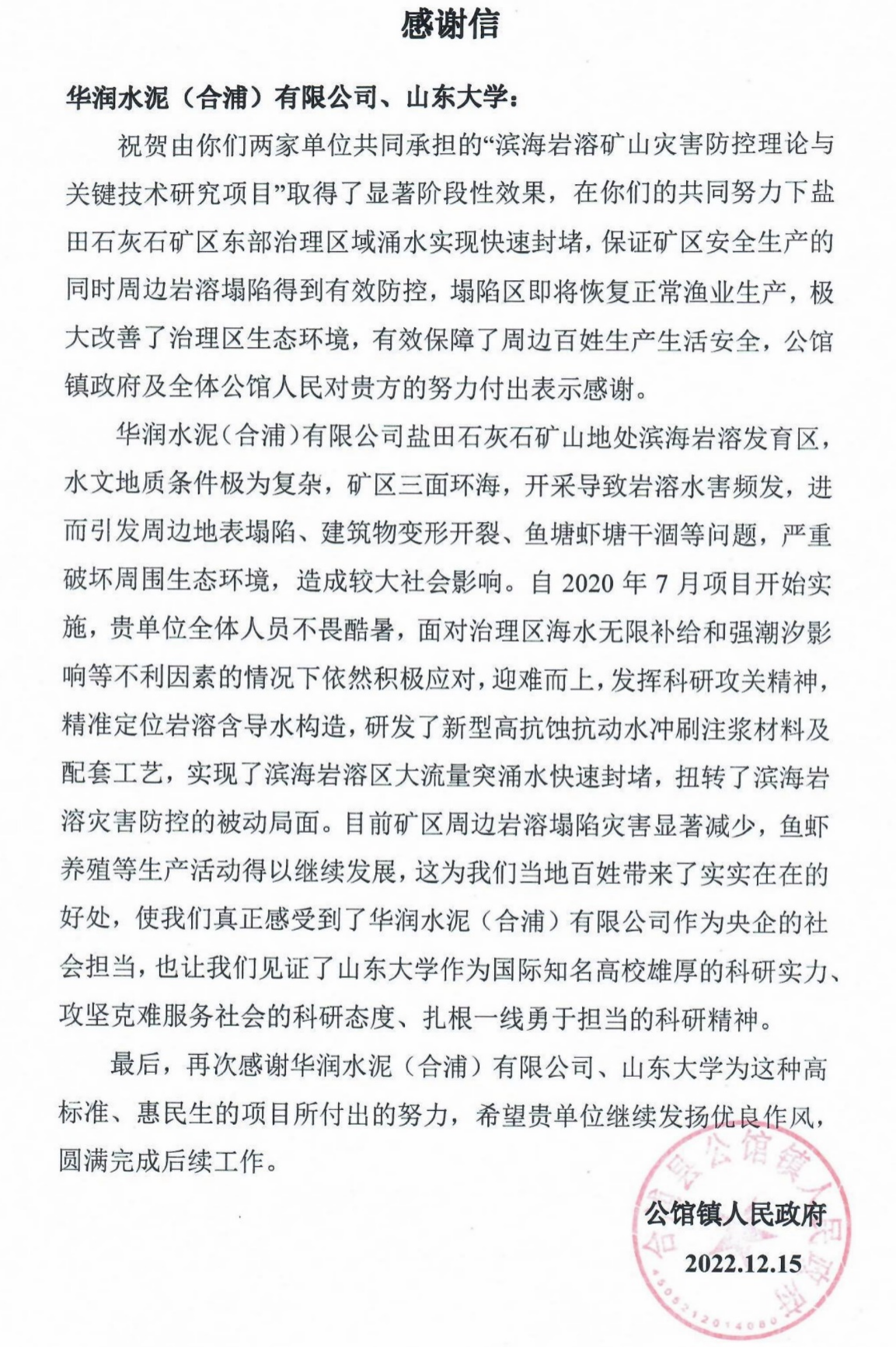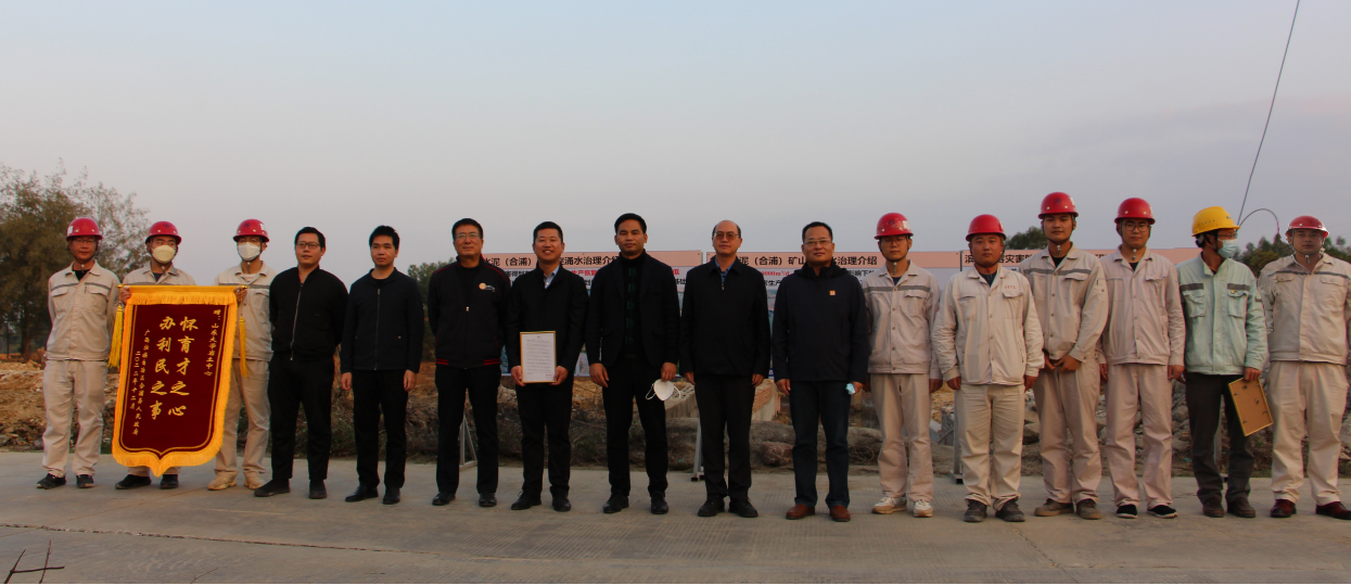 经过一个水文年监测,矿山治理区域无海水渗漏,周边区域岩溶塌陷得到有效控制,受损渔业恢复生产,极大改善了矿区生态环境,为当地带来了显著的经济效益和社会效益。合浦县人民政府对此高度重视,特组织县、镇政府领导现场查验治理情况,对工口实验室 的精益求精的专业精神、严谨的科研作风、敬业奉献的工作态度予以表彰,对项目取得的阶段性科研效果高度认可,特致函表示感谢并赠予锦旗鼓励。