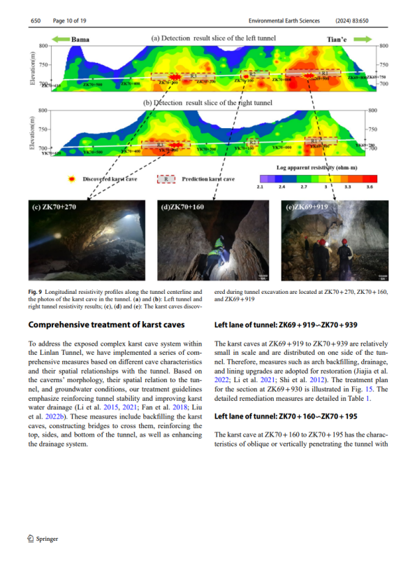 该项研究工作聚焦于复杂地区隧道工程中喀斯特洞穴的探测与治理。未被探明的喀斯特洞穴在隧道掌子面处可能导致突水灾害,对隧道工程的施工安全构成了重大挑战。该项工作采用了先进的半航空瞬变电磁法(SATEM)探测起伏地形区域的潜在喀斯特洞穴;利用基于手持式同步定位与地图构建(SLAM)技术的激光雷达设备,准确高效地扫描大型暴露洞穴,为喀斯特洞穴治理方案的设计提供支持。针对不同的喀斯特洞穴特征,该项研究提出了一系列有效的综合治理方法,包括封闭、穿越和填充策略。该项工作首次展示了半航空瞬变电磁法探测技术在检测高阻洞穴方面的有效性,并成功预测了林兰隧道中的多处干涸洞穴,所提出的半航空瞬变电磁探测技术与综合治理技术体系不仅确保了天峨-巴马高速公路施工的安全,还为喀斯特隧道工程提供了重要的工程指导意义。