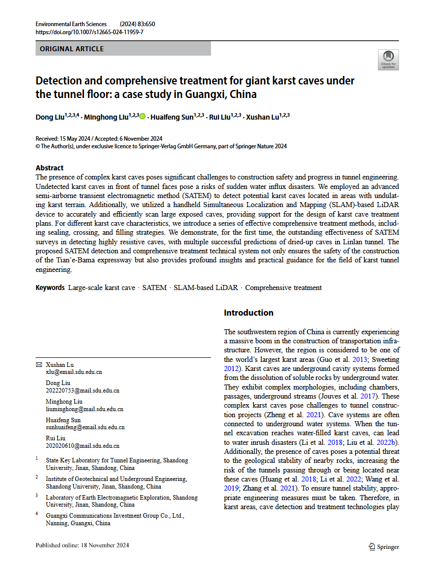 岩土工程系孙怀凤教授课题组在地球科学领域著名期刊《Environmental Earth Sciences》(影响因子2.8,JCR分区为Q2)上发表研究成果:Detection and comprehensive treatment for giant karst caves under the tunnel floor: a case study in Guangxi, China。博士研究生刘东为第一作者,博士研究生刘明宏为第二作者,岩土工程系副研究员卢绪山为通讯作者。该论文得到了广西重点科技发展计划项目、国家自然科学基金项目和泰山学者奖励计划共同资助。