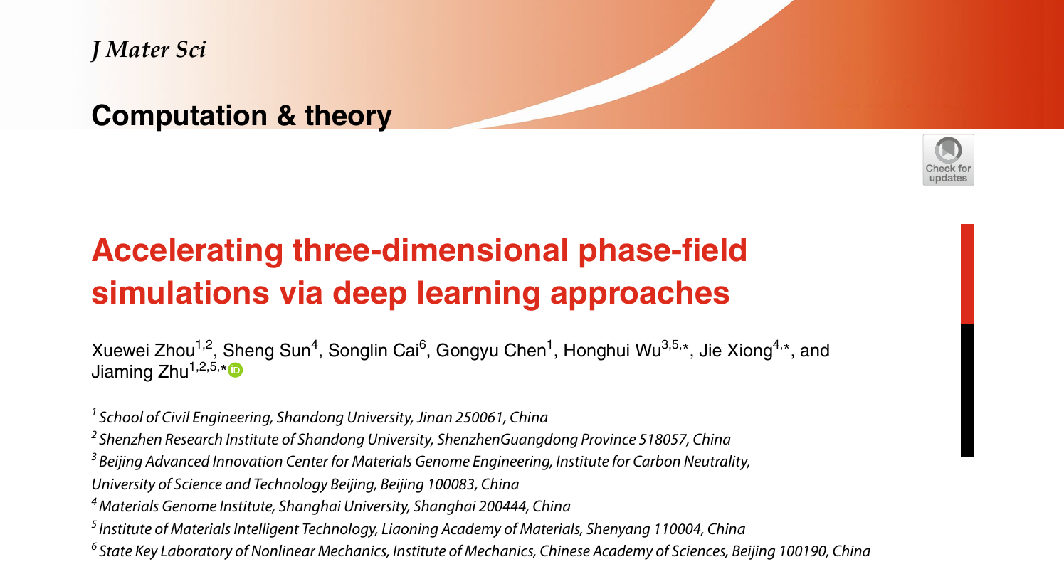相关成果以 Accelerating three-dimensional phase-field simulations via deep learning approaches为题,发表在国际学术期刊《JOURNAL OF MATERIALS SCIENCE》上。工程力学系朱家明教授为本文的通讯作者,硕士研究生周学伟为第一作者,该论文得到了国家自然科学基金、山东省自然科学基金的支持,工口实验室