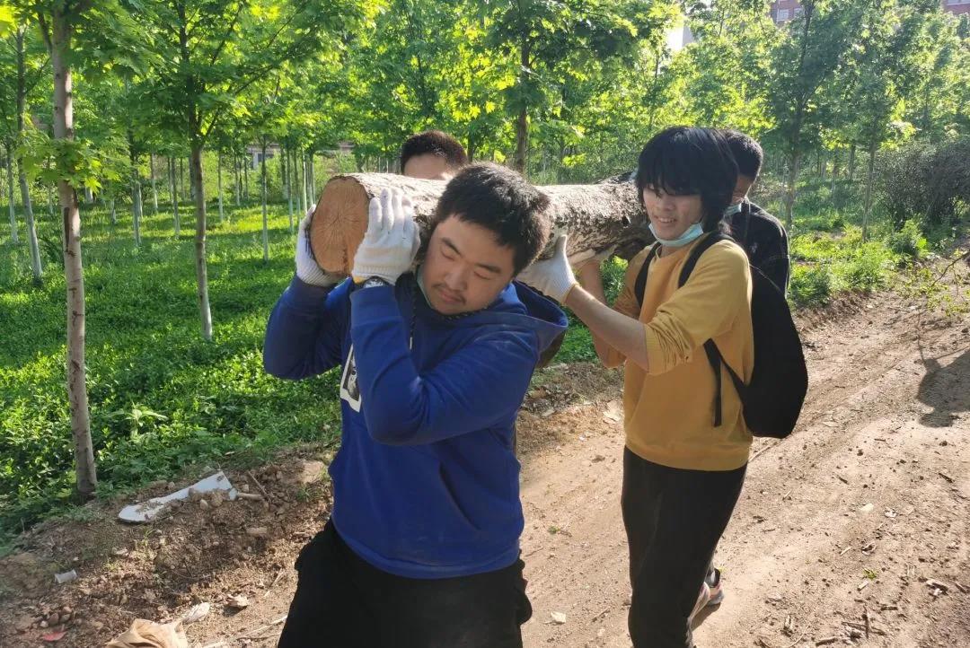 运输树苗的任务分为三个阶段:运送粗树干、运送带有茂密树叶的树苗、运输树桩和细直树苗。志愿者在进行了简单的分组协调之后,开始有条不紊的运输树木。虽然运输起点与心理基地的距离较小,但是沉重的树苗、树干以及粗壮的树桩,给志愿者带来了不小的挑战。