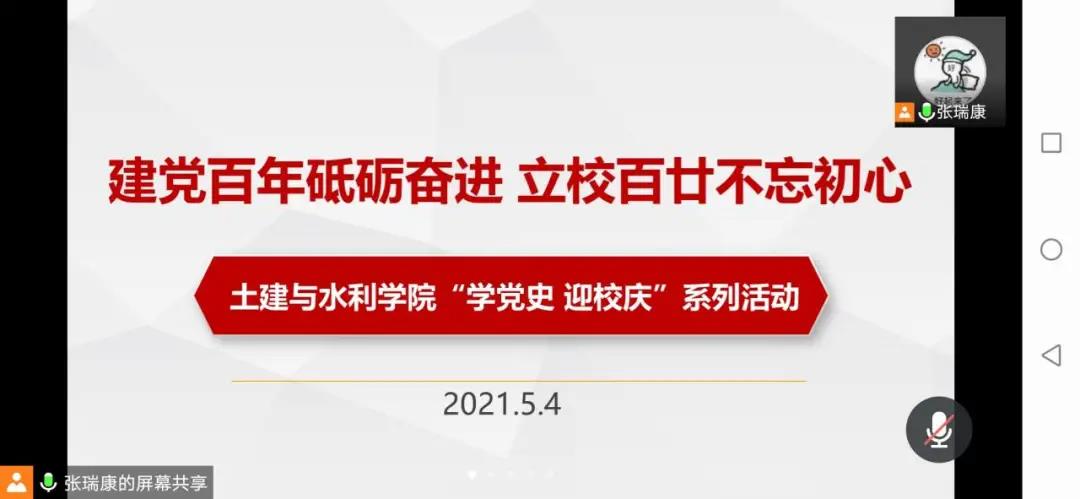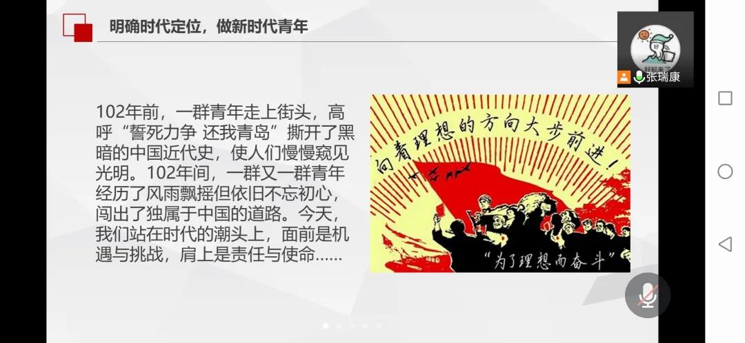 值此五四青年节之际,张瑞康首先为同学们播放了电视剧《觉醒年代》中“五四”大师们送给青年人的寄语剪辑,并以此鼓励同学们在时代的潮头,勇于面对机遇与挑战,肩负起责任与使命,明确自身定位,做新时代青年。随后,张瑞康带领同学们进行了“四史”的学习。他表示,在学习“四史”知识的同时,同学们更应注重对于历史进步规律和发展趋势的把握,以史为鉴,汲取历史教训,提高思想认识,也应在学习历史的过程中学习历史人物的精神,不畏艰难,奋勇前行。除此之外,张瑞康向全体学生干部着重强调了“为同学们服务”的办事宗旨,他表示,全体学生干部应当认认真真为同学们办实事,并在建党百年,建校百廿的重大历史节点上有所作为。最后,学生组织各部门汇报了“学党史,迎校庆”系列活动的筹备情况,张瑞康进行了汇总协调,并对此做了一些关键性的强调与补充。