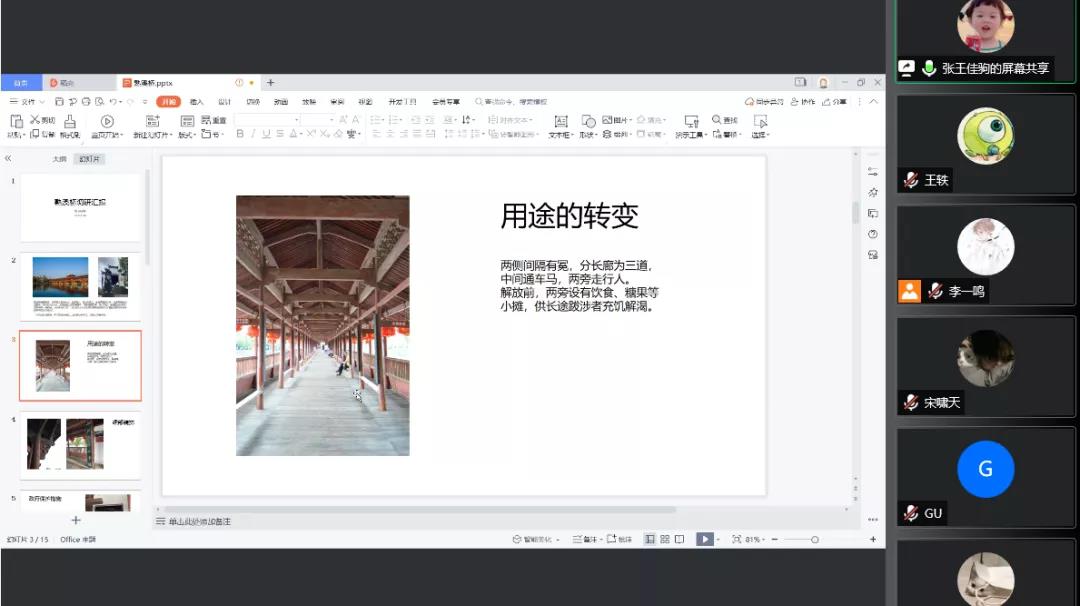 “寻筑”调研团于腾讯会议举行第四次线上分享会,对社会实践成果进行汇报。队长李一鸣主持会议,成员张王佳驹对浙江省金华市武义县熟溪桥调研的相关内容展开分析汇报,成员宋啸天、张钟华、王轶以及指导老师谷建辉参与本次分享会。