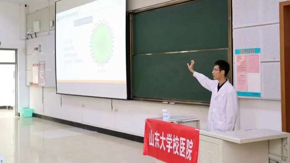 随后,臧威向同学们介绍了几种校园常见的传染病及相对应的防控措施。他从呼吸道传染病、肠道传染病和血液、性接触传染病三个方面出发,结合实际案例,与同学们分享了意外伤害与卫生应急的相关知识。如面对突发的皮肤烫伤情况时,应遵循“冲-脱-泡-盖-送”五步骤;面对宠物咬伤应及时用肥皂水冲洗并接种狂犬疫苗;鼻出血和扭伤骨折等突发状况,应及时冰敷缓解……他为同学们扫除了一些急救知识盲区,同学们获益匪浅。