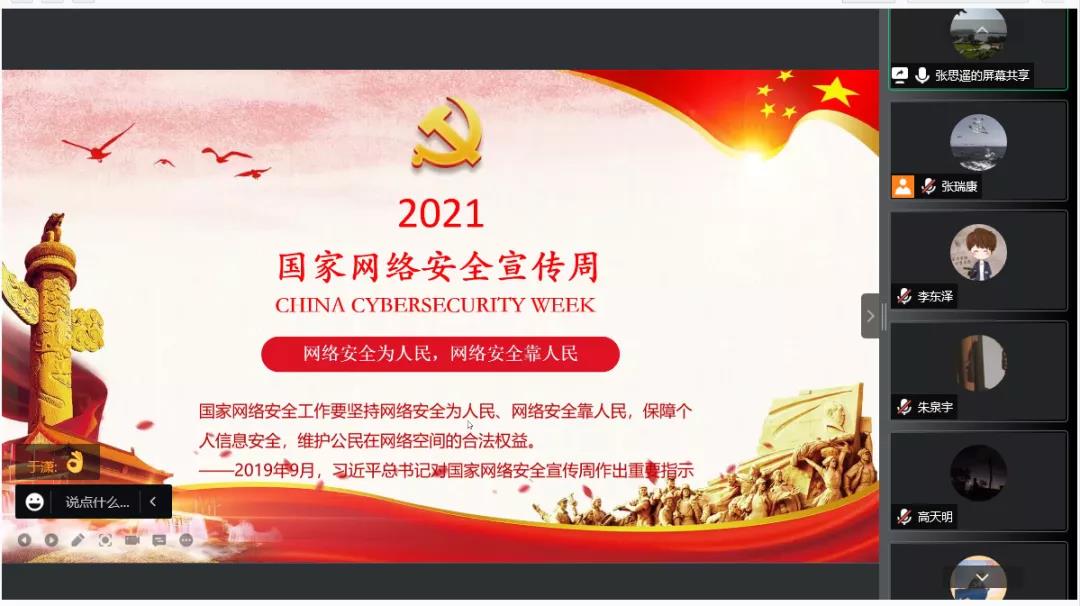 本科生第一党支部于线上开展“网络安全为人民,网络安全靠人民”主题党日活动。本次活动由张瑞康主持,张思遥、高天明、徐溢、张晋分别从不同角度分享近期学习体会,支部全体党员参加活动。