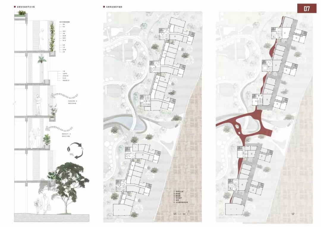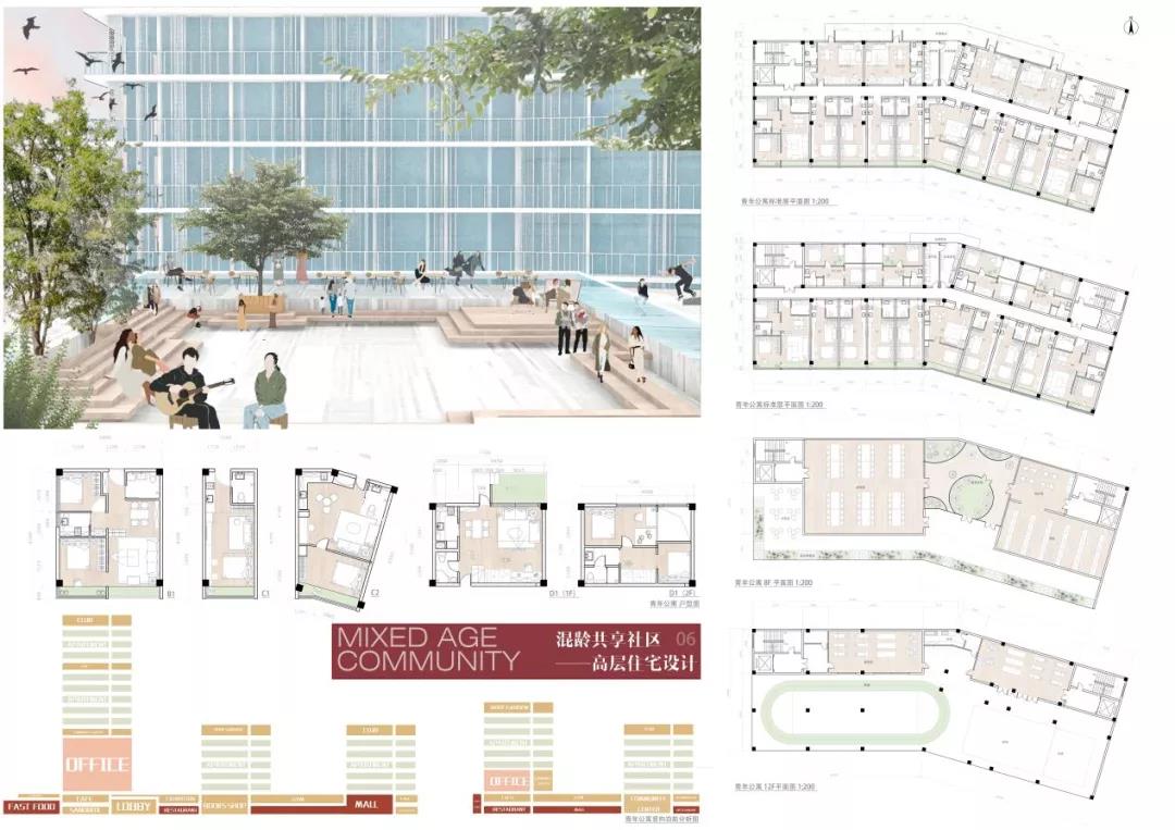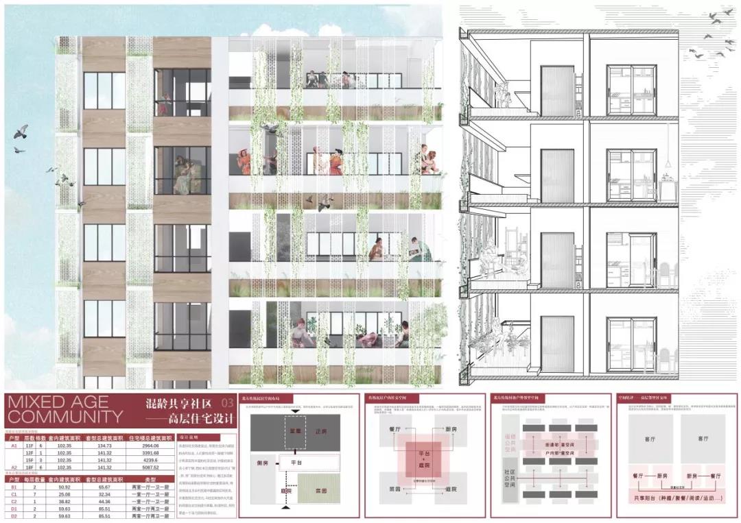 杨辰雨和张雨晴的作品关注度在于:在虚拟社交高度发达,真实的邻里社交活力减弱的当代社会,人们居住在同一屋檐下却鲜少有真实而丰富的交流活动,个体之间缺乏关心与理解。重塑多层级、有活力的邻里社交圈,构建灵活共融、绿色健康的混龄共享社区成为本次住区与住宅设计所关心的重点问题。