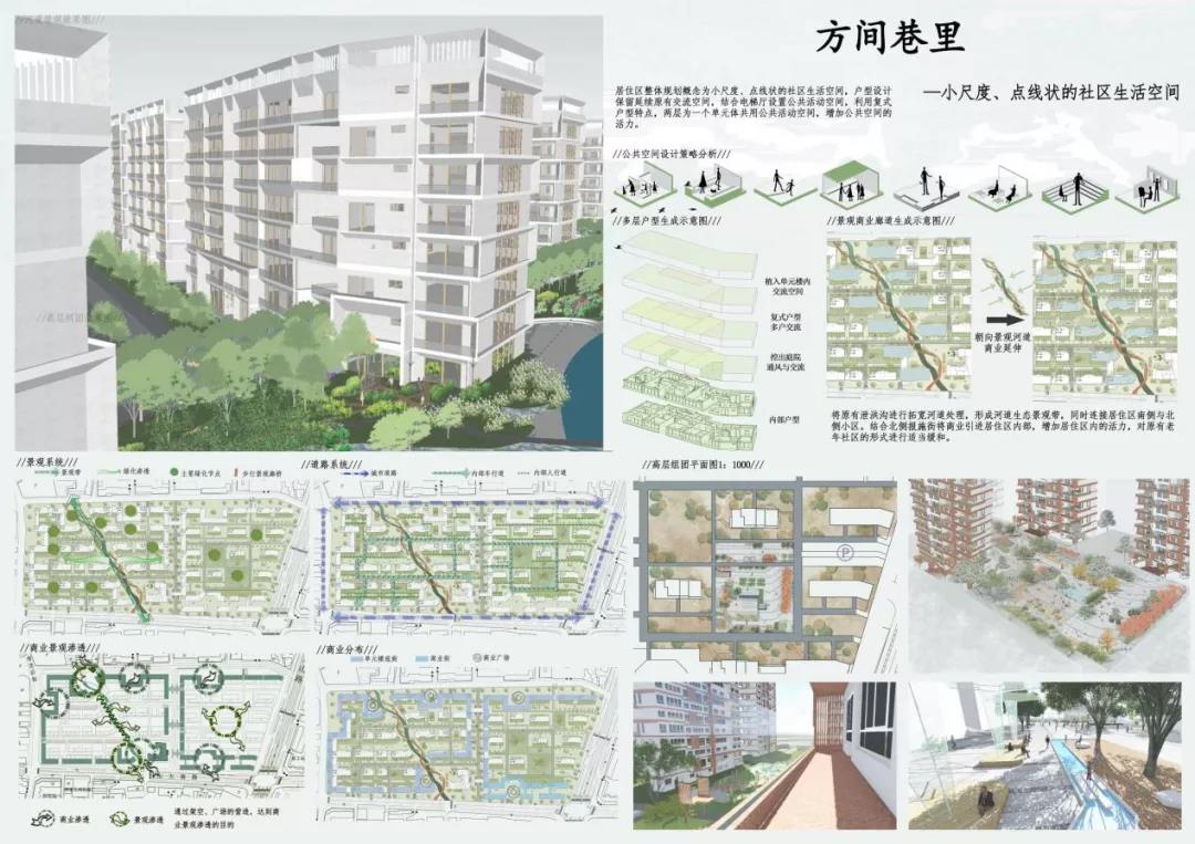 王璨的作品选取“方间巷里——市井生活"为概念,按照老社区原有的生活氛围设计,从空间肌理上来看是对旧有市井街巷的尺度重塑。综合考虑周边建筑、沿街小商业、经济商圈、噪声、人群活动、视野等方面进行设计。将周围居民、生活和行人融入社区,保留老社区原有的生活氛围,在社区内部依托街巷布置不同尺度的活动绿地,形成可容纳市井生活的生活天地。