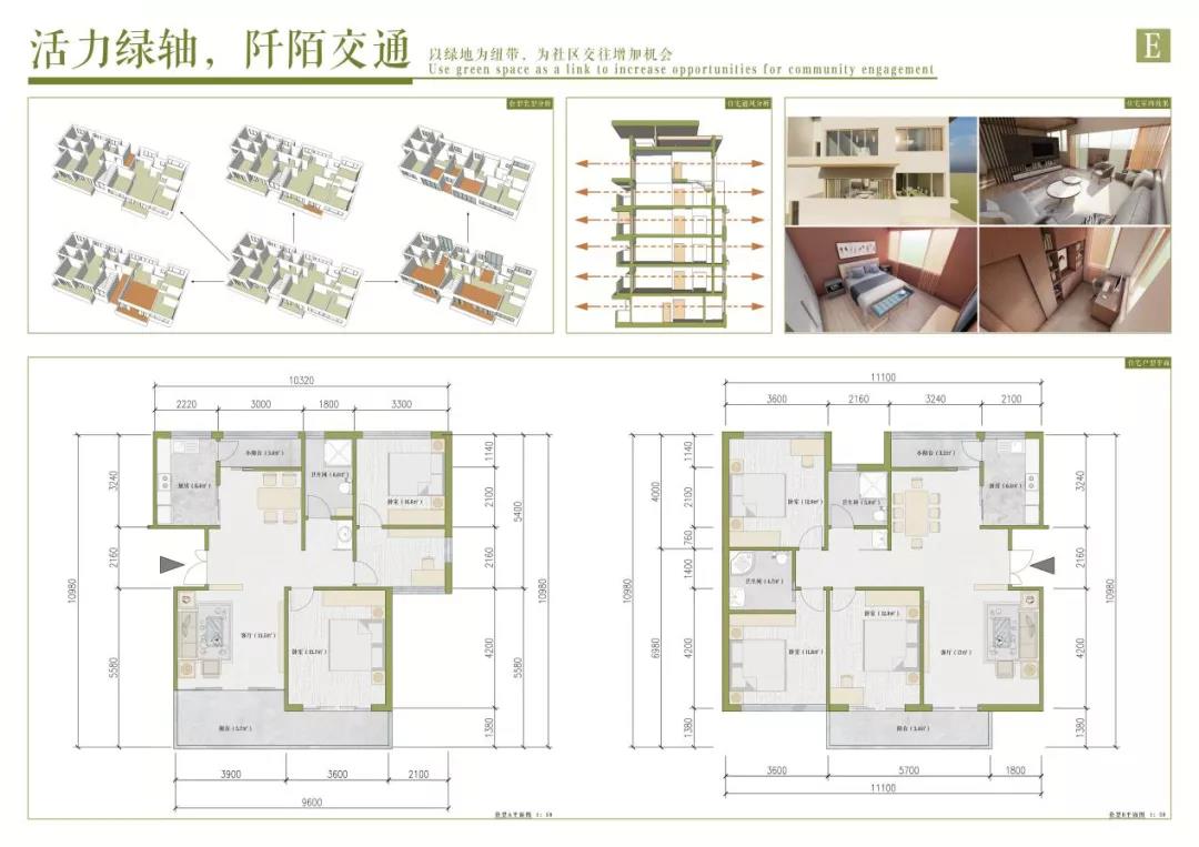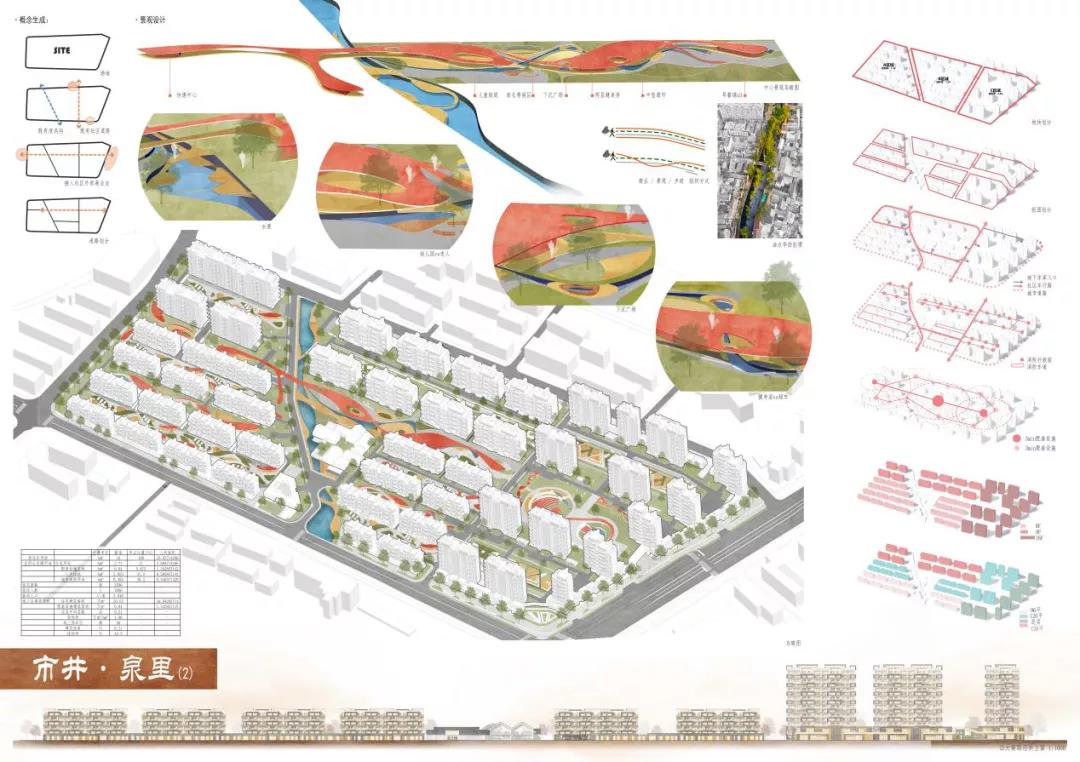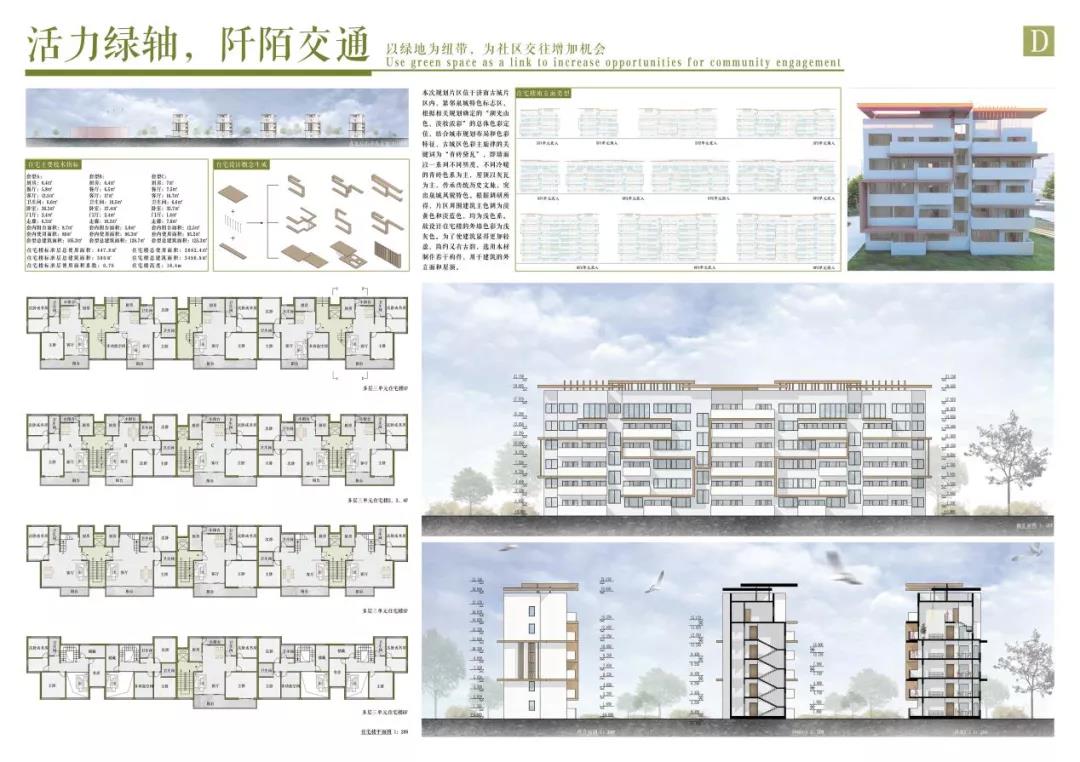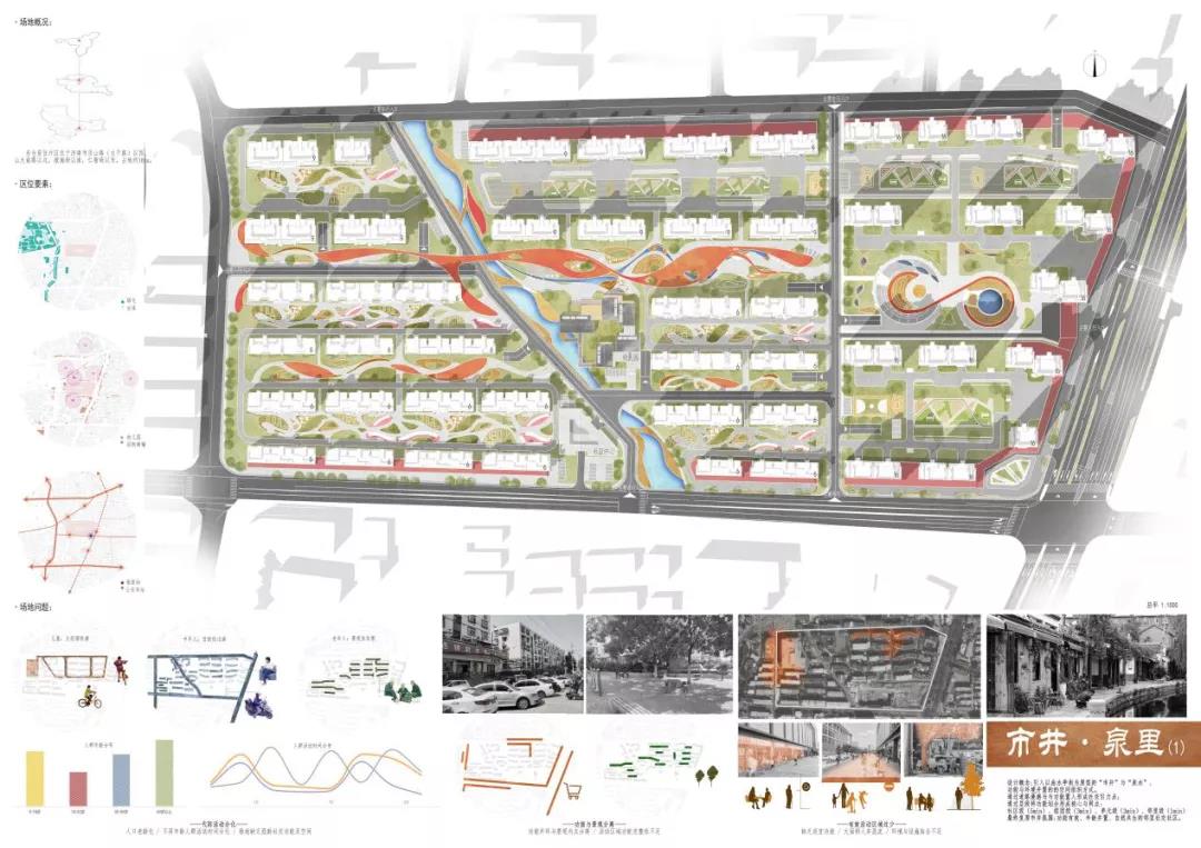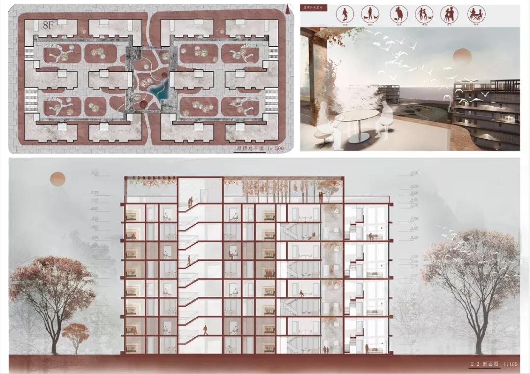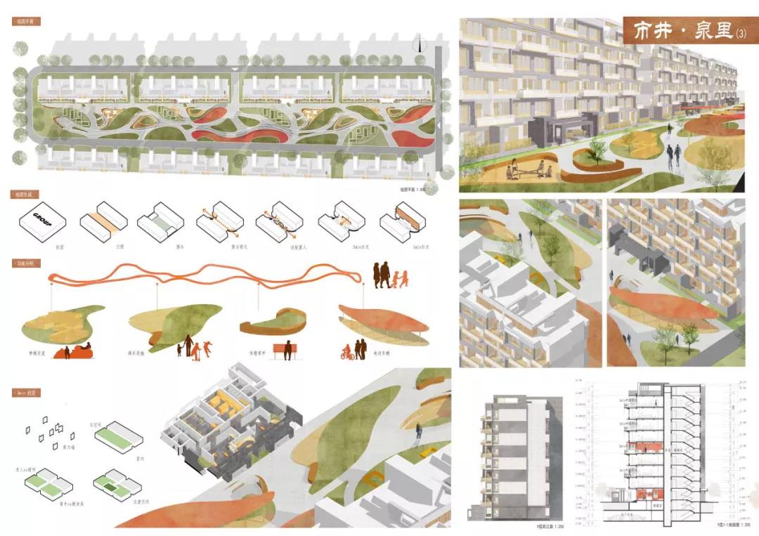 该设计通过引入以曲水亭街为原型的“市井”与“泉水”、功能与环境并置的的空间组织方式,试图形成全龄有效的公共社交活动空间;并分级形成完善的“核心与网点”社交体系,即社区级(5min/中心景观轴+社区商业)、组团级(3min/漫游休憩+便民设施)、单元级(2min/层间共享书屋)、邻里级(1min/邻户共享种植阳台),最终复原老济南“功能有效、年龄并置、自然共生”的传统社交氛围。
