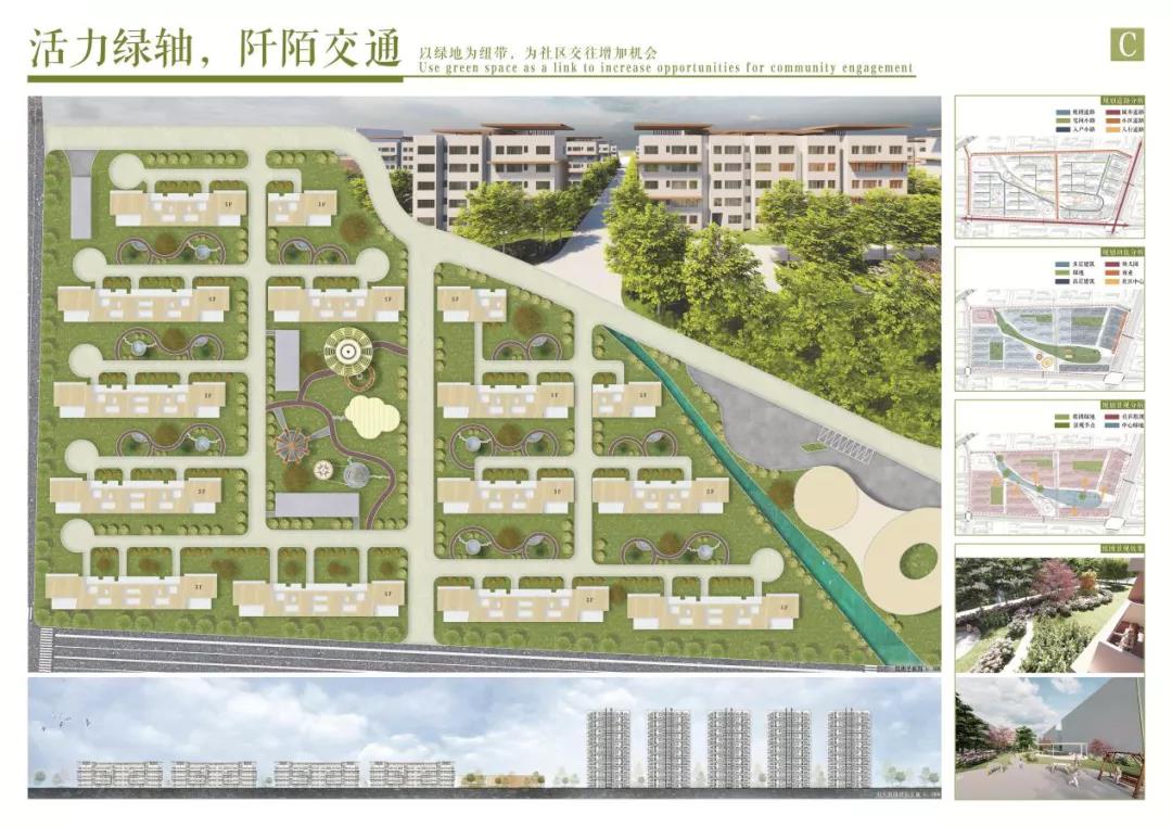 赵心如的作品是基于调研发现,该场地存在功能与景观分离的问题,即环境良好安全的空间居内,设施齐全便捷的商业空间居外,使得既有公共活动空间品质较低(缺乏商业引力或环境较差)、老人(环境导向)与年轻人(功能导向)代际分化。