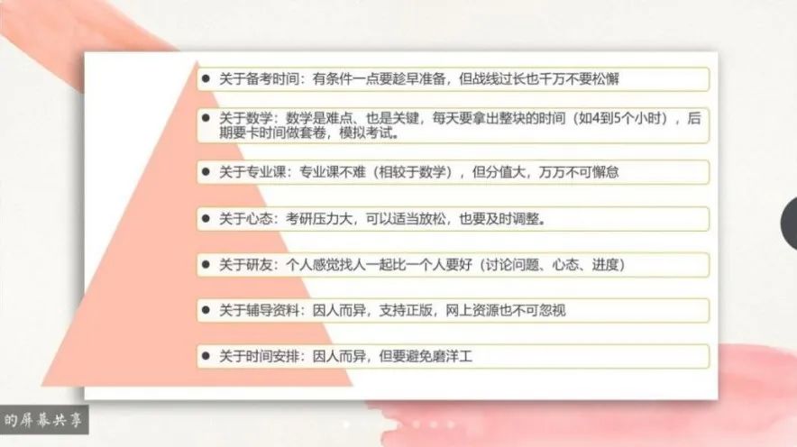 在考研方面,王家昌、朱秋帅、王国梁给同学们讲述了自己考研历程时间线与各科的学习资料。在备考时间计划、各科备考方案、心态等方面给了复习建议,并建议考研时找研友一起学习。此外,王国梁结合自身经历为同学们提供了一些调剂方面的建议。