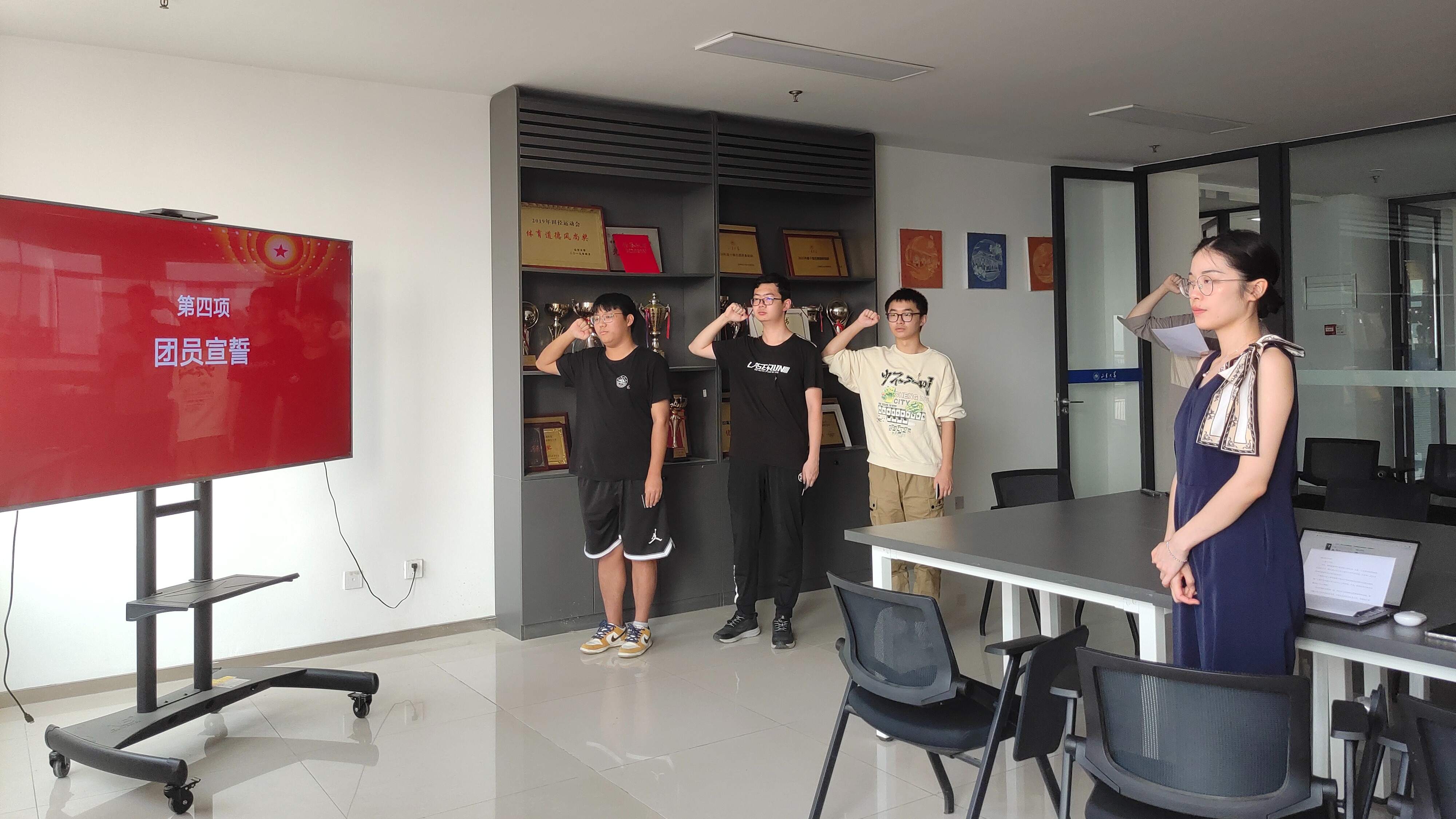 会议伊始,在场人员共唱《中华人民共和国国歌》。接着,何玥对新入团团员表示祝贺,她指出,中国共青团作为党的助手和后备军,是党联系青年的桥梁和纽带,大家要遵守团的章程,认真履行团员义务,听从党的召唤,服从团的领导。她激励新团员要坚定理想信念,规范自身行为,努力提升道德修养,以身作则,成为学习生活中的表率。罗湘明宣布了本次新成员名单,何玥为刘基业、张仕龙、邓长友三位新团员佩戴团徽,颁发团员证。随后,罗湘明带领新团员庄严宣誓。