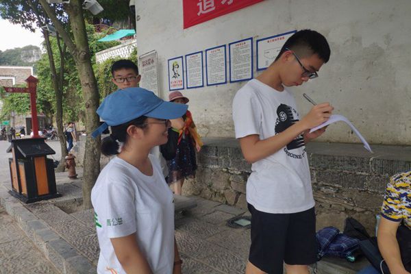 上午8时,全体成员从镇远中学出发乘坐公交车到达目的地,首先队长洪涛带领团队参观青龙洞。实践队队员在参观时了解到,青龙洞古建筑群位于镇远古镇城东中河山,有青龙洞、紫阳书院、中禅院、万寿宫、祝圣桥和香炉岩6部分共36座单体建筑组成,集儒、道、佛、会馆、桥梁及绎道建筑文化于一身;分别采用了“吊”、“借”、“附”、“嵌”、“筑”等多种工艺,是贵州省最大的古建筑群。下午1时,团队九人兵分三路开展调研,针对不同群体发放问卷。问卷内容涉及被采访者的年龄、学历、对古建筑的认识和保护意识等问题。分发问卷的过程中,团队成员随机发放,充分做到了问卷需要的随机性和普遍性。在与游客的沟通过程中,团队成员充分做到了耐心、礼貌、细心,发放问卷进展的十分顺利。