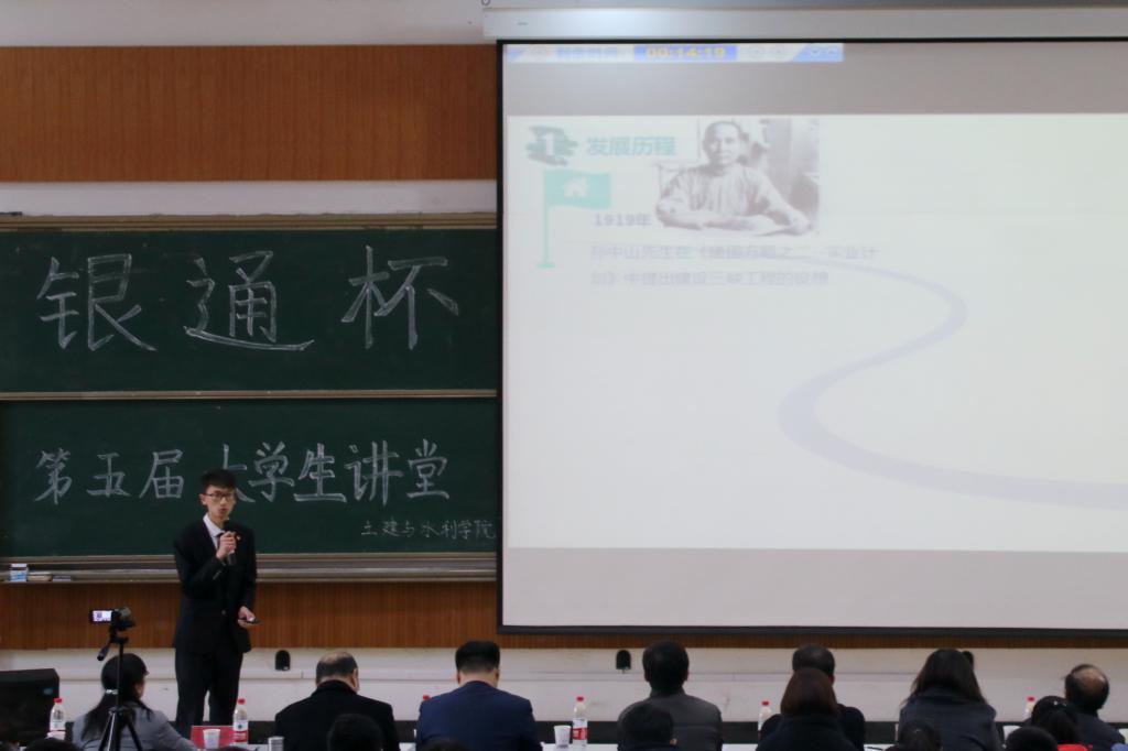 下午2时,比赛正式开始。经过初赛和复赛的层层选拔,共有十名选手脱颖而出,进入到决赛的角逐中。来自17级水利班的费琦翔以济南交通拥堵的现状为切入点,从必要性、制约条件和可操作性三方面讨论了济南地铁与地水的关系。17级土木一班吕玥则以中华传统文化为主题,描绘出一幅华夏文明的瑰丽画卷,体现着当代青年的文化自信。作为水利水电专业的学生,马震林以别样的视角解读了三峡大坝的前世、今生与未来,使在场观众对这一水利工程有了进一步的认知与了解。而来自17级地空二班的蔡玉梅则通过对城市地下工程现状的分析与展望,表达了自己对专业的热爱与期待。选手们从多重角度出发,围绕人生态度、时间规划、专业发展、家庭教育等主题,通过生动的讲说向评委和观众们展示了独特的思考与感悟。比赛的最后,朱伟做简要点评,他既肯定了选手们的选题方向和现场表现,高度评价了大学生讲堂的创新性、参与度与影响力;也就选手着装、演讲准备、现场互动等方面提出了意见和建议,从而帮助选手进一步提高。