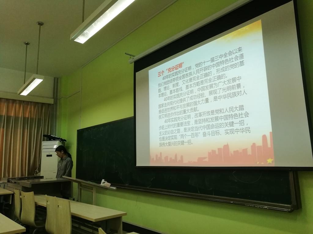 武成凤首先从总体上向大家介绍了改革开放以来我国取得的伟大成就、40年来积累的宝贵经验以及改革开放对于我国里程碑式的意义。卫旺旺在展示中着重讲述了改革开放40年来我国在免费义务教育、素质教育等方面取得的进展和经验,令与会人员意识到我国在追求兼顾教育公平和教育个性化方面做出的努力。姚兰则强调了改革开放以来我国外交政策的变化,由此体现出中国在自身强大的同时不断为世界谋求和平、发展和进步的大国担当精神。于润泽从40年来我国的国防和军队建设的成就讲起,带领党支部成员了解把握我国的强军强国之路。李景韵结合专业实际,讲述了工匠精神及其对我国制造业发展的重要指导作用。此外,本次活动中还进行了学期的工作总结,并针对实际情况,对下学期的工作开展做出了规划和部署。