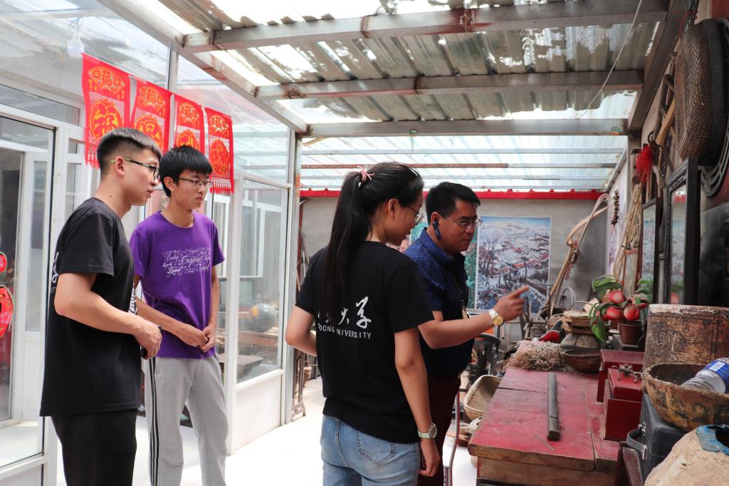 简单介绍后,成员们采访了庄园主人王桂军。王庄主是当铺地村的知名人物,喜欢收藏老物件,也在不断为当铺地村的文化建设努力。他首先向队员们介绍了会客厅里各种各样的文物古董,有前苏联的老式留声机和钟表,抗战时期的照相机以及民国时期的结婚证书和地契和娱乐用的扑克、麻将等,王庄主指出,会客厅里的毛主席语录颇有纪念意义,值得一读。随后,王庄主带领队员们参观了其他展览厅,展品琳琅满目,对历史研究有许多参考价值。参观中,王庄主告诉同学们,房间墙面外糊了许多新中国成立以后的旧报纸,这样有助于来访者时刻了解革命红色历史,传递并传承红色精神。最后,王庄主鼓励同学们积极了解中国发展历程,奋发勇为,助力中国发展。