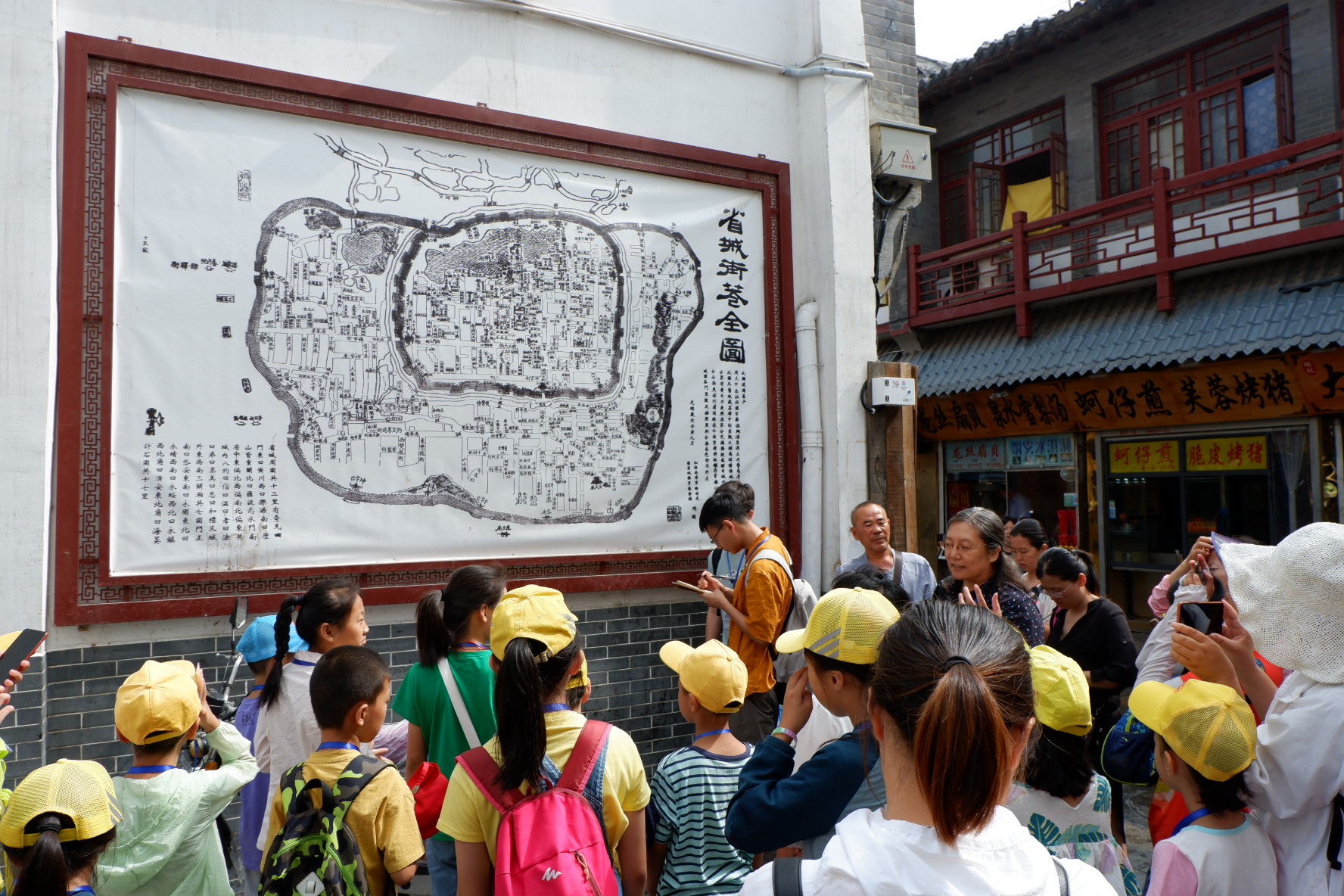建筑学系副教授谷健辉,实践团队队长王钰林,队员宋文豪、贾欢欣在芙蓉街南门牌楼处同参与活动的孩子们集合完毕,研学之旅正式开始。步行于芙蓉街中,谷健辉向大家详细介绍了临街建筑的特征,从飞檐翘角的传统到拱券的结构运用,再到精美的壁画,一些细致入微、不易被人关注的知识,诸如石地板的排布方式、窗户上的花纹形式、建筑彩绘的色彩组成及比例,谷健辉都为孩子们娓娓道来。借助济南老地图,芙蓉街的前世今生和周边街道的肌理一一呈现在孩子们面前。在曲水亭街,谷健辉着重讲解普及了济南泉文化以及构成济南特色街道的冷泉系统。在“家家泉水,户户杨柳”的街区中,济南独特的人居环境对人的影响,古建筑、街巷的文化价值,深入每位活动参与者的心中。活动过程中,山大团队的助教还对孩子们的听课效果进行了检测性提问。大家积极参与互动问答,气氛热烈。答对题目的孩子们都获得了老师们准备的小礼品,收获颇丰。