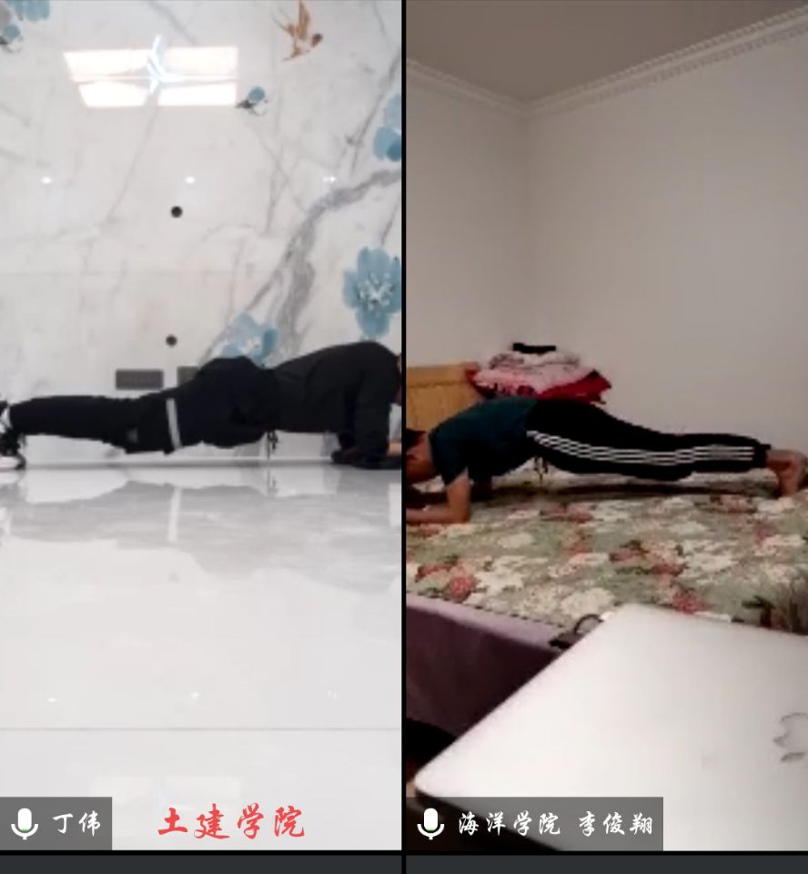 和海洋学院分为一组,在同一会议室里同时进行。裁判员老师严格执行比赛标准——身体呈一条直线,全程静止,大臂之间距离与肩同宽,且与地面垂直,直到动作完全标准才开始计时。在参赛过程中,学院的每一位同学都完美地执行了这一标准,会议室等待比赛的同学也积极为参赛同学加油喝彩,展示了一个强大、自信且团结的工口实验室