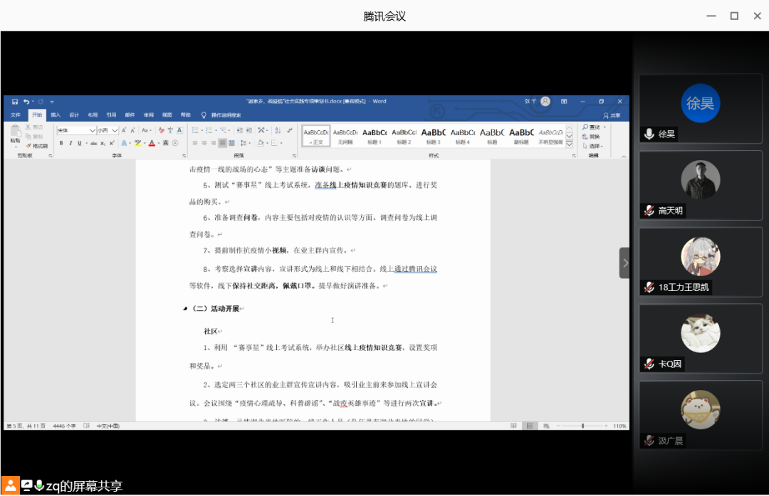 团队计划将在未来几天开始进行准备工作,学习疫情期间心理疏导、科普辟谣的相关知识,收集战疫英雄的相关事迹,为宣讲ppt做准备。随后,队员刘路遥、许文彬等人汇报了与当地社区交接工作的进展。此次社会实践获得了多个社区的大力支持,宣讲海报和“复工复产”的主题传单也会在社区的帮助下线上线下广泛进行传播。除此之外,实践团队队员们群策群力,明确了详细的分工安排,整理了社区访谈和问卷调查中所需的问题,也对活动中存在的突发情况进行了相关的讨论,提前做好准备。最后,张千再次向团队成员强调了活动的注意事项,他强调同学们在宣讲过程中要确认好社交距离,戴好口罩,保证自身的安全。