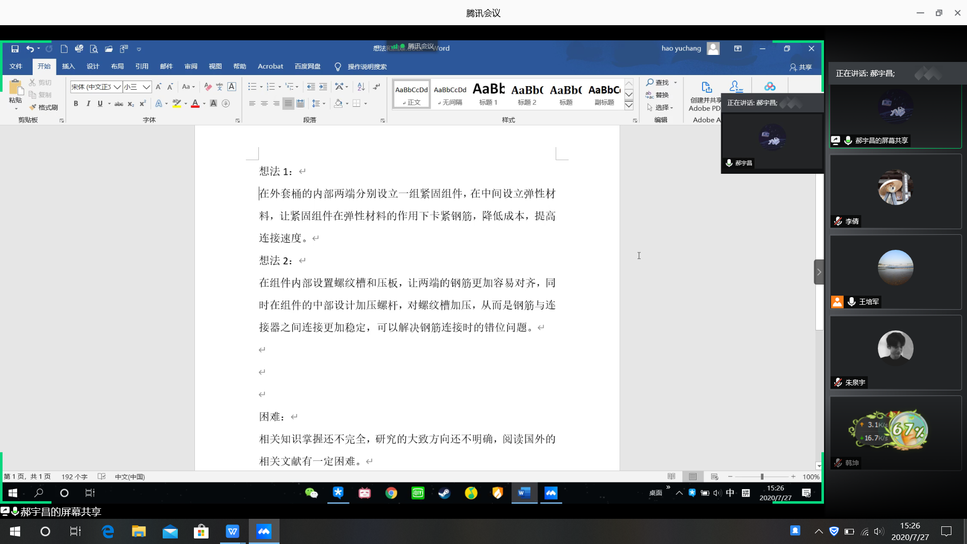 “研发一种装配式混凝土构件用钢筋连接件”创新创业实践调研团队召开线上研讨会。会议由指导老师王培军出席,队长朱泉宇主持,全体团队成员参加。