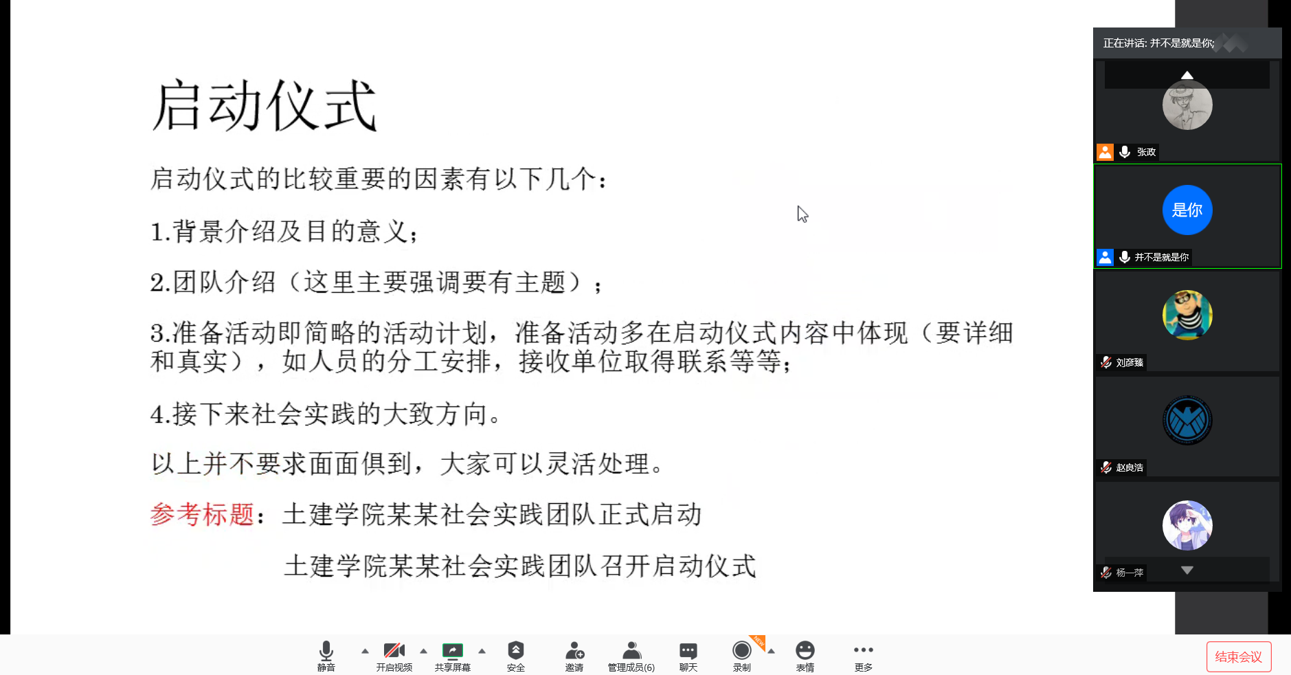会员尾声,张政指出活动的安全问题,强调若计划采取线下采访形式,采访队员应做好防疫措施,注意个人人身安全。