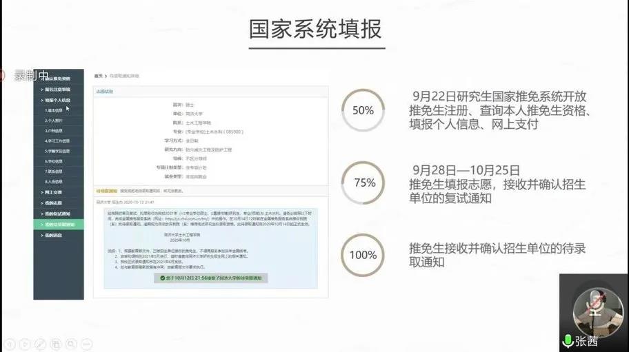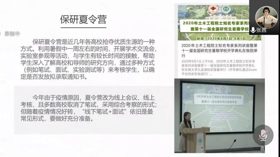 本次保研经验分享会由保研流程综述、详细介绍本校保研和各项单列保研、如何选择、如何准备四个方面展开。首先,郑星阳介绍了近几年土木工程系的保研率,建议同学们对自身条件进行评估,考虑自己保研成功的可能性。接着,他对“夏令营”、“预推免”和“九推”进行了简单介绍。张茜表示,学分绩点和比赛活动是取得保研资格的主要方式,同时强调了四六级的重要性。她向同学介绍了保研夏令营的参加流程,建议有意向的同学做好参加线下笔试和面试的充分准备。王晓阳从成绩排名推优和单列计划推优两方面进行讲解。他说明了工口实验室