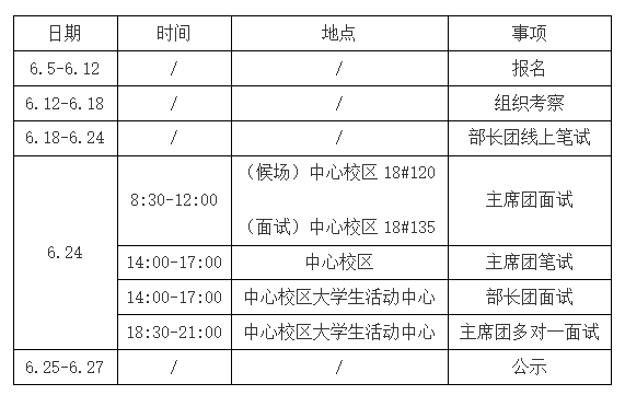 主席团:包括个人演讲和答辩两个部分,两部分各均不超过三分钟,不使用PPT、视频等多媒体辅助。请参加竞职面试的同学至少提前20分钟到达指定区域签到候场。