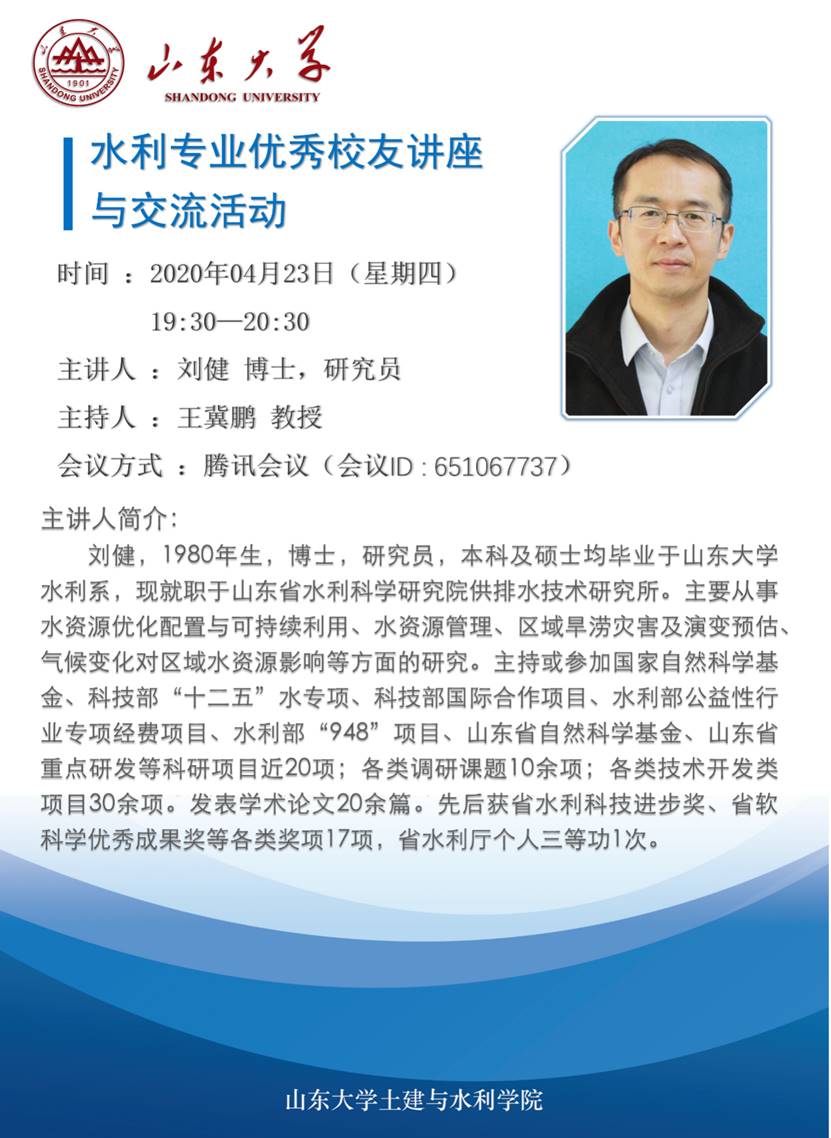 青年学子的云端恳谈。他首先分析了中国的水资源现状:我国水资源四大问题为水多、水少、水脏、水浑,主要表现在洪涝灾害、水资源短缺、泥沙问题、生态环境需水量逐步提高四个方面;中央一号文件聚焦水利、“海绵城市”建设推进、河湖长制贯彻落实、五大战略与“两山论”指导工作方向,在当今中国发展进程中水利事业具有重要地位。他带领同学们走进水世界,在广义和狭义上认识何为水资源,深度了解水循环,辨析水文学概念及其分类,学习了解水文的不确定性。在他看来如今水利专业青年学子正面临前所未有的历史发展机遇——国家重大需求与学科前沿挑战,水科学可衍生出水利部、应急管理部、生态环境部、自然资源部,水利专业青年学子生逢其时、大有可为。