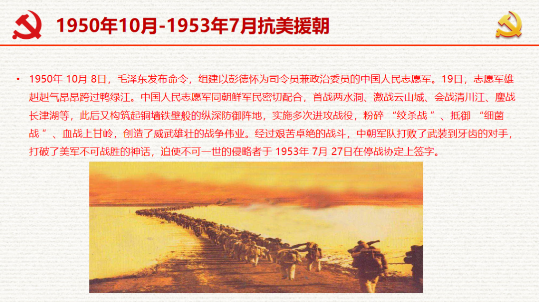 艾颂然带领团员们学习了1949年至1978年的党史。在这段时期,中国人民经历了革命和建设道路的曲折探索,总结了经验教训,给中国的发展带来了很多启示。艾颂然列举了其中具有代表性的事件,包括了新中国成立、抗美援朝、全国人大一次会议的召开等。他详细地讲述了各个事件的过程及影响。1949年10月1日,开国大典在首都北京举行。领导和组织人民革命取得胜利的中国共产党成为了执政党,踏上了带领人民创造幸福美好生活的新征程。党的历史也揭开了新的篇章。1950年10月至1953年7月的抗美援朝战役中,中国人民志愿军经过艰苦卓绝的数次战斗,打破了美军不可战胜的神话,使中国的国际地位空前提高。1954年9月,第一届全国人民代表大会第一次会议在北京召开,通过了《中华人民共和国宪法》,确定了中国人民行使当家作主权利的政治制度,指明了为建立社会主义社会继续奋斗的正确道路。此外,他还带领大家总结了“文化大革命”的影响和教训。最后,艾颂然向同学们介绍了焦裕禄、毛岸英和王进喜的奉献事迹和卓越贡献,同学们纷纷发表了自己的感慨,表明了向革命先辈学习的决心。至此,本次会议圆满结束。