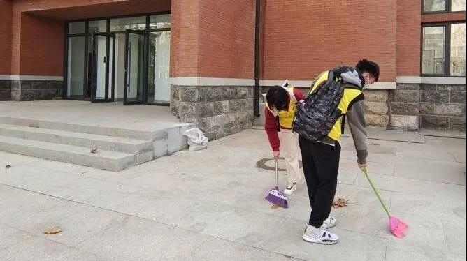 悠久历史的见证,矗立在校园一隅。初冬时节落叶纷纷,散乱在地,遮掩住它的魅力。志愿者们跟文史楼工作人员取得联系后,拿着扫帚便开始帮文史楼换新衣。活动中,尽管落叶不尽,但志愿者们仍认认真真地完成清扫文史楼前的工作,并连带着把周边环境也打扫了一遍。期间还碰到中心校区的同学也在不远处清扫,两支队伍会心一笑。