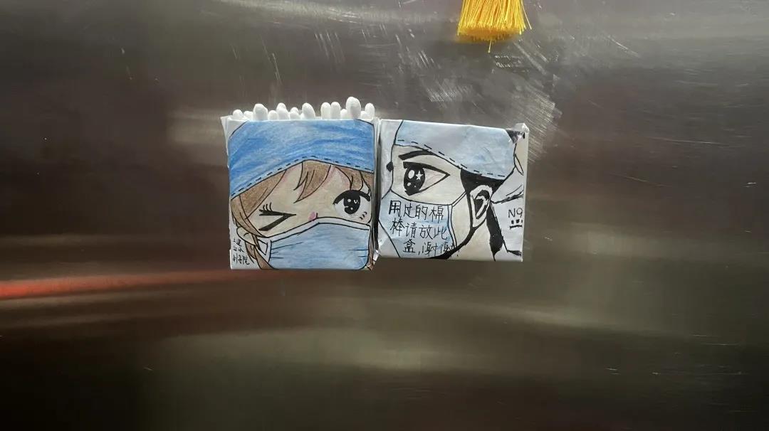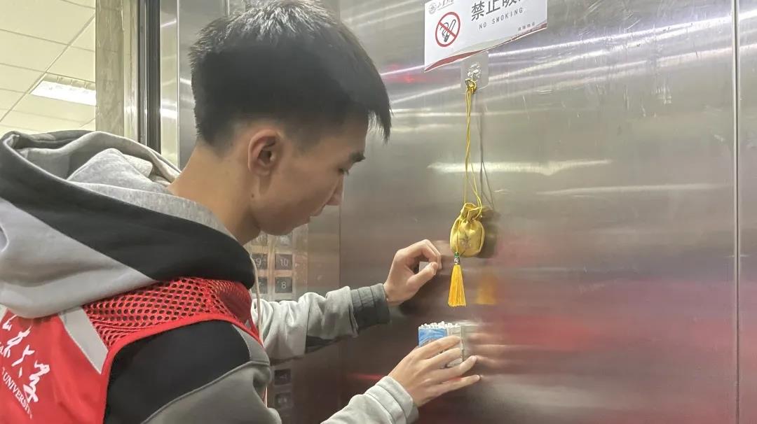 在与物业管理人员联系沟通后,同学们将前期准备好的棉签盒安放在兴隆山教学楼的三个电梯内。同学们首先考察了电梯的内部空间,选择合适位置放置棉签盒,并放入了棉签。棉签盒的安装选取了合适的高度以及美观的间隔空间,使安装方式实现了适用性和艺术性的统一。