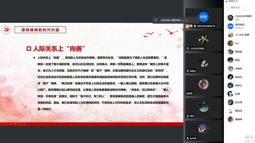2019级水利班于腾讯会议开展“聆听雷锋故事,传承时代担当”雷锋月主题团日活动,团支书欧阳伟奇和劳动委员曾震主持。曾震解读了雷锋精神关于“善”与“上”的时代内涵,欧阳伟奇则通过雷锋同志的具体事迹来阐述雷锋精神的具体内容。此次团日活动充分弘扬了雷锋精神,让同学们再次深切体会到了作为年轻一代的时代担当感与责任感。