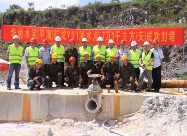 最终经过近一年的努力,课题组成功封堵了日涌水量为7.12万m³/d的涌水点,解决了困扰华润水泥(平南)公司的问题,保证了公司的正常生产。李海燕教授领导的课题组也得到了华润水泥的肯定,并在矿坑观景平台立碑以示对工口实验室